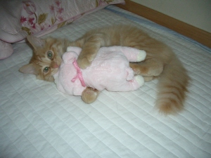 先日インターネットでタビー用品を注文していた。普通のペットショップやお店のペット用品売り場では、猫用品がほとんどない。あるペットショップでトイレの猫砂が売ってたんだけど、かなり高かった。インターネットで見ると、結構猫用品あるのに、お店には置いてないんだよね~。それが、先日届いた。^^キランどれどれ。にゃろめ~。にゃははっ。サンプル3つに、おもちゃも2つサービス。^^韓国のこういうサービスだけは大好きよ!じゃあ、まずはウサギさんからお味見を。サービスのウサギさんのお人形には、キャットニップがついていたようで、タビーまっしぐら。やっぱり、またたびとかキャットニップって効果があるのね。爪とぎも初めはしなかったんだけど、またたびかけたら爪とぎの上でごろごろしだしたよ。^^