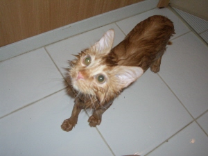 前の家にはバスタブがなかったんだけど、今回引っ越したアパートにはバスタブがある。^^日本から持ってきた温泉の元を入れて、のんびりお湯につかって、幸せ~。のはずが・・・その至福の時を奪ったのは、、タビー。お風呂の戸がきっちり閉まってなかったようで、戸を押して入ってきた。湯船のお湯に手を突っ込んで、パシャパシャ。湯船のふちをうろうろ。かわいいかわいい。^^が・・・湯船のふちに座りながら、お尻をふりふりしだした。このお尻ふりふりは、なにか目標に向かうための準備運動。タビーの目標は。。反対側の湯船のふち。反対側のふちは壁にくっついてる。無理。ただでさえ運動神経・バランスの悪いタビー。無事に渡れるわけがない。ちゃんとタビーには言ったのよ。落ちるから辞めなって。まぁ、一度落ちて学習するのもいいかなと思ったけど。。親心です。^^が・・・親心、猫知らず。。ジャンプ~!バシャン、、落ちた。。実際落ちたタビーを目の前にすると、焦ってしまい。。救いの手を差し伸べてしまった。。タビーは私に抱きついてきて、両手を背中に。ギャーーー!ガリッと引っかかれ、とどめに爪を皮膚にグサっと。。タビーを体からはなそうとしても、爪がくいこんで取れない。なんとかタビーを離したが、背中は・・・タビーのアホタレ!!!そろそろ爪切らないとと思ってたけど、、やられた~。。(泣)こうなったら・・・^^♪ずぶぬれついでに、シャンプーね。^^反省する大ネズミ?そんな小技、わたしには効きません。タビーの大嫌いな爪切り。ばっちり切りましたとも。^^