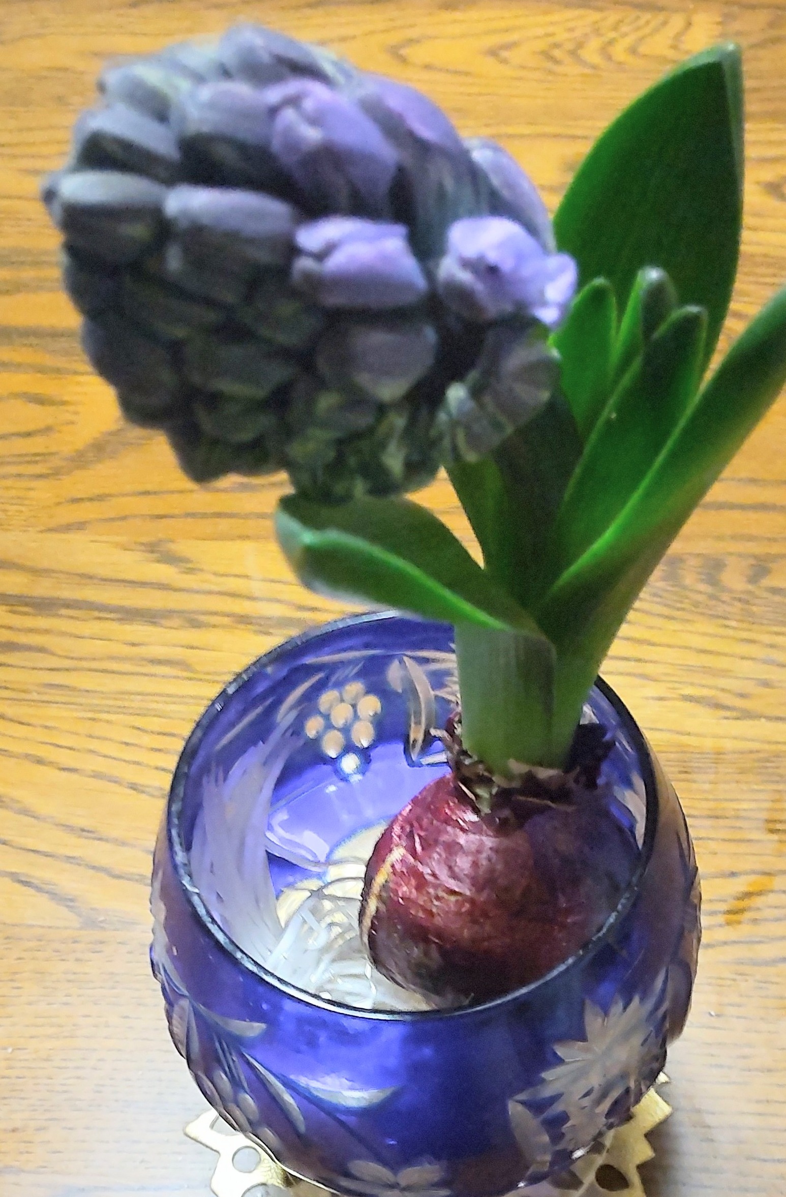切子のグラスに球根が水に浸からないようにして飾ってみました