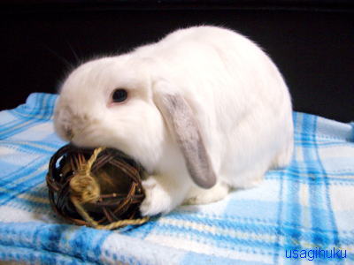 ビワボールです♪♪夜の運動タイムに、ビワボールを持ってくると、どこにいても猛ダッシュでやってきます(*^▽^*)『わ~い!ビワボールだぁ!ガシッ』『うっ。ビワの葉が・・・とれな~い。』『振り回しちゃえ♪ブンブン!!』『うまうまっ♪』『ぼくのオススメですぅ(*・。-*~☆』この日は、お上品な感じですが・・・いつもブンブン振り回して、軽く1メートル位、ビュ~~ンと飛ばしたりして、飛ばした先で、また飛ばして・・・を繰り返して、おもいきり楽しんでいま~す(≧∇≦)/ うさぎさん用の手作りハーネス・リード・ハンドメイド雑貨のオンラインショップ『うさぎふく』をしています(*^▽^*)『うさぎふく』のご質問などのお問い合わせは、HPの「お問い合わせ」からお願いします☆*