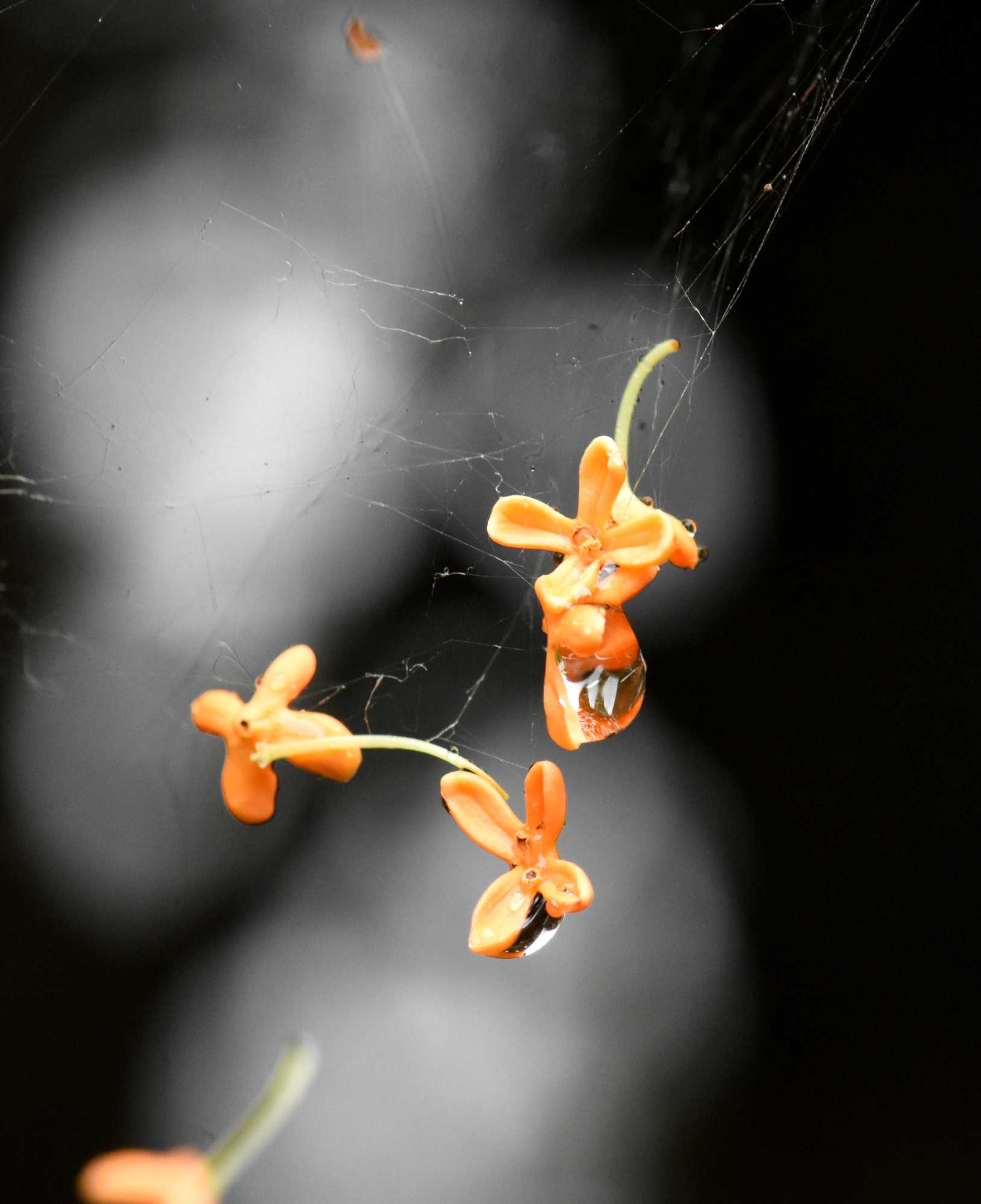 雨の日は気分もどんより。雨の日はたいくつ。でも、外に出よう。きっと宝石が見つかるから。見つけたのは、金木犀の散り花についた水滴。蜘蛛の巣はやさしいハンモックになって、水滴も楽しそうにつかまっている。みんなで滑り台。ウォータースライダーかな。紅白の縁起物のミズヒキはひと花ひと花に水滴のおまけが。