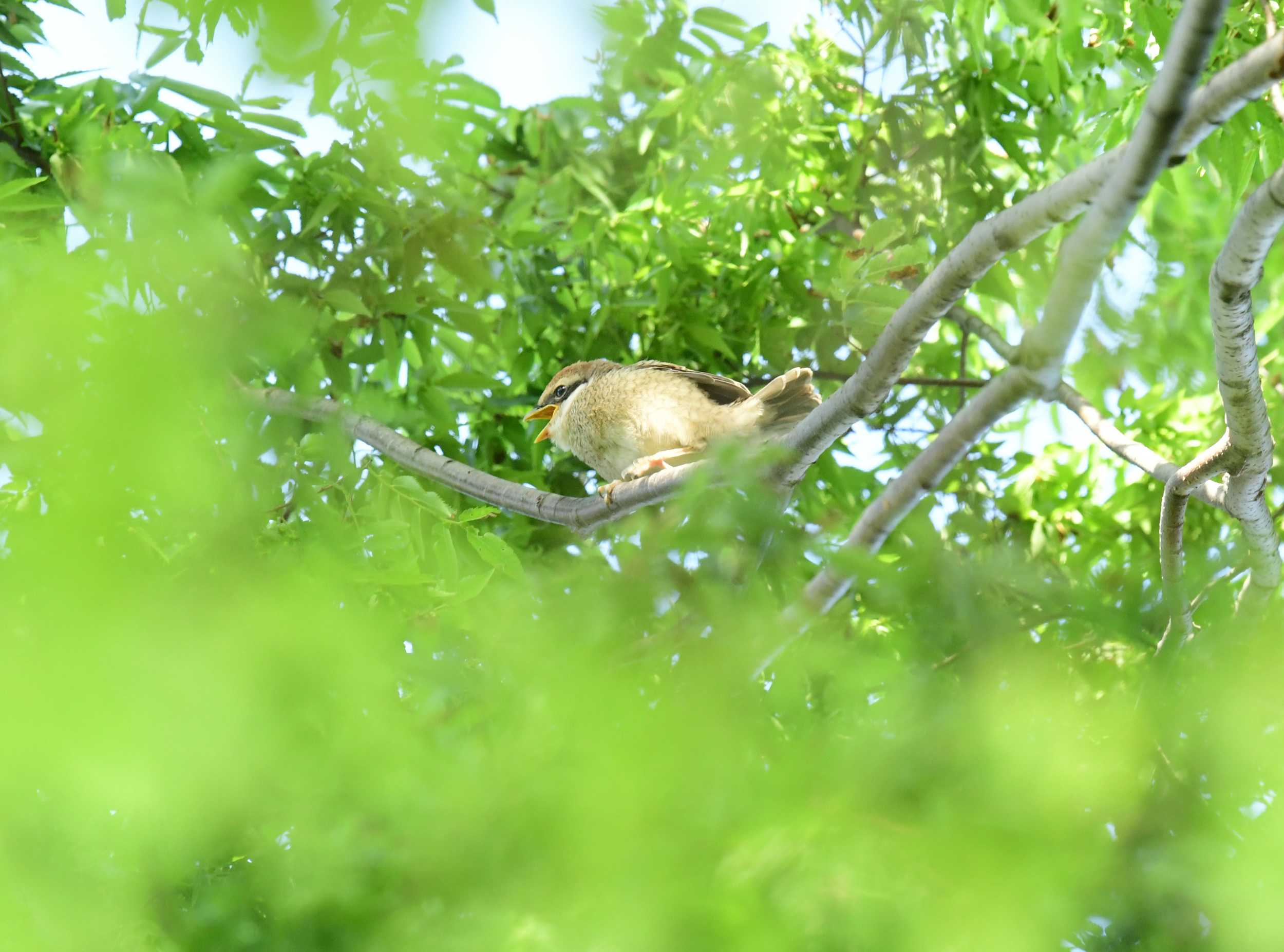 モズの営巣の続きです。ヒナは巣立ちして、巣の近くの高い木の中に身を潜めていました。そこへ親がエサを運んでいます。新緑の中で「くれくれ」いうヒナ。右上で餌をもっているお父さん。左下に口をあけているヒナが。こちらは八重桜の中で待つヒナ。うーん、かわいい。(#^.^#)下の方に親を見つけて「くれくれ」ポーズ。「くれなかった。いっちゃった。」餌が来るまで間があるので、しばらくは木の中で羽づくろい。なんだか目がこわい。('◇')ゞやっと餌の順番がまわってきたような。せいいっぱいの「くれくれ」ポーズ。お父さんは黒い虫をもってきました。ヒナの口の中に入れてやりました。桜の中でのモズの親子給餌は初めて見たかもしれません。(#^.^#)