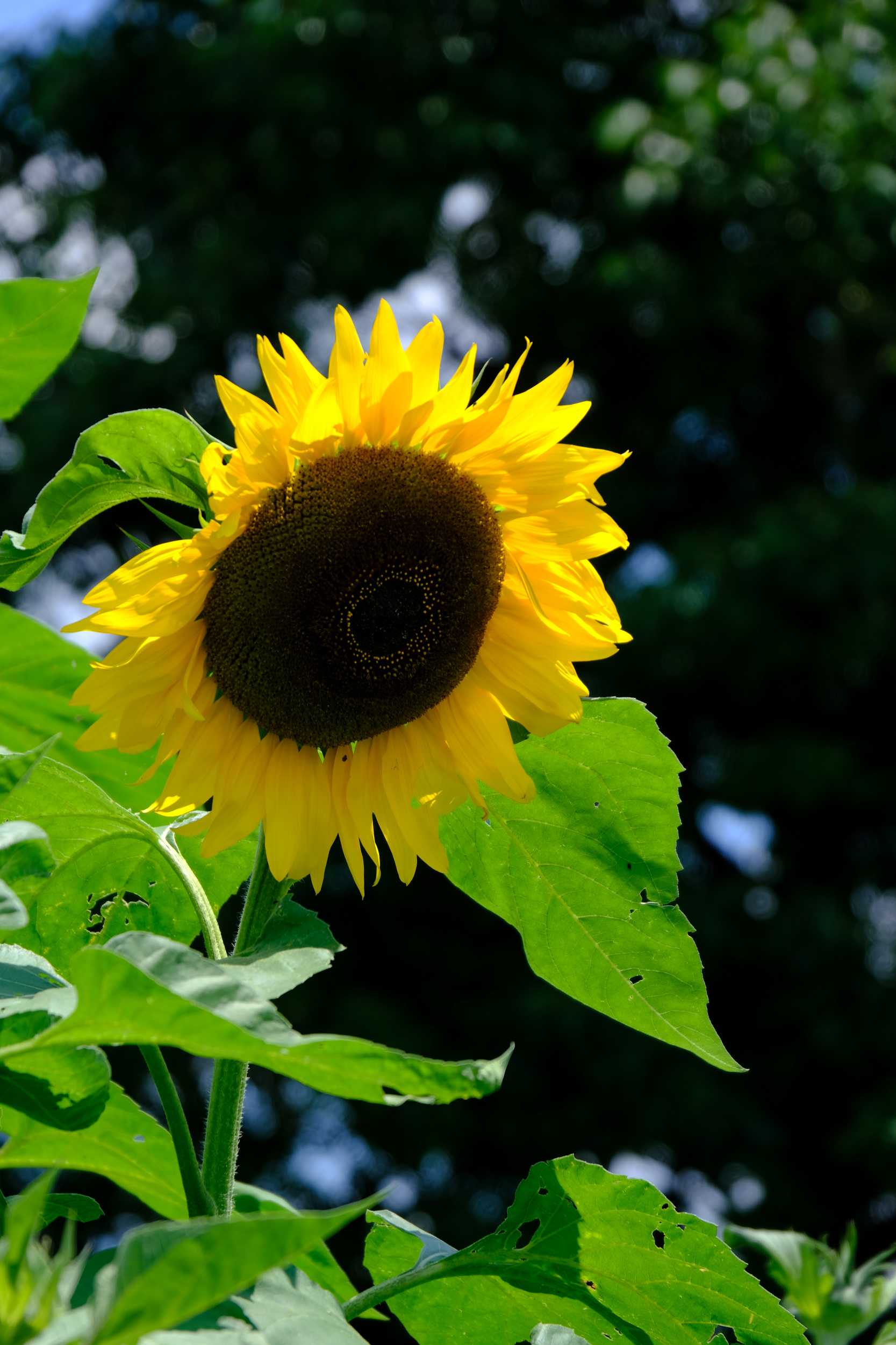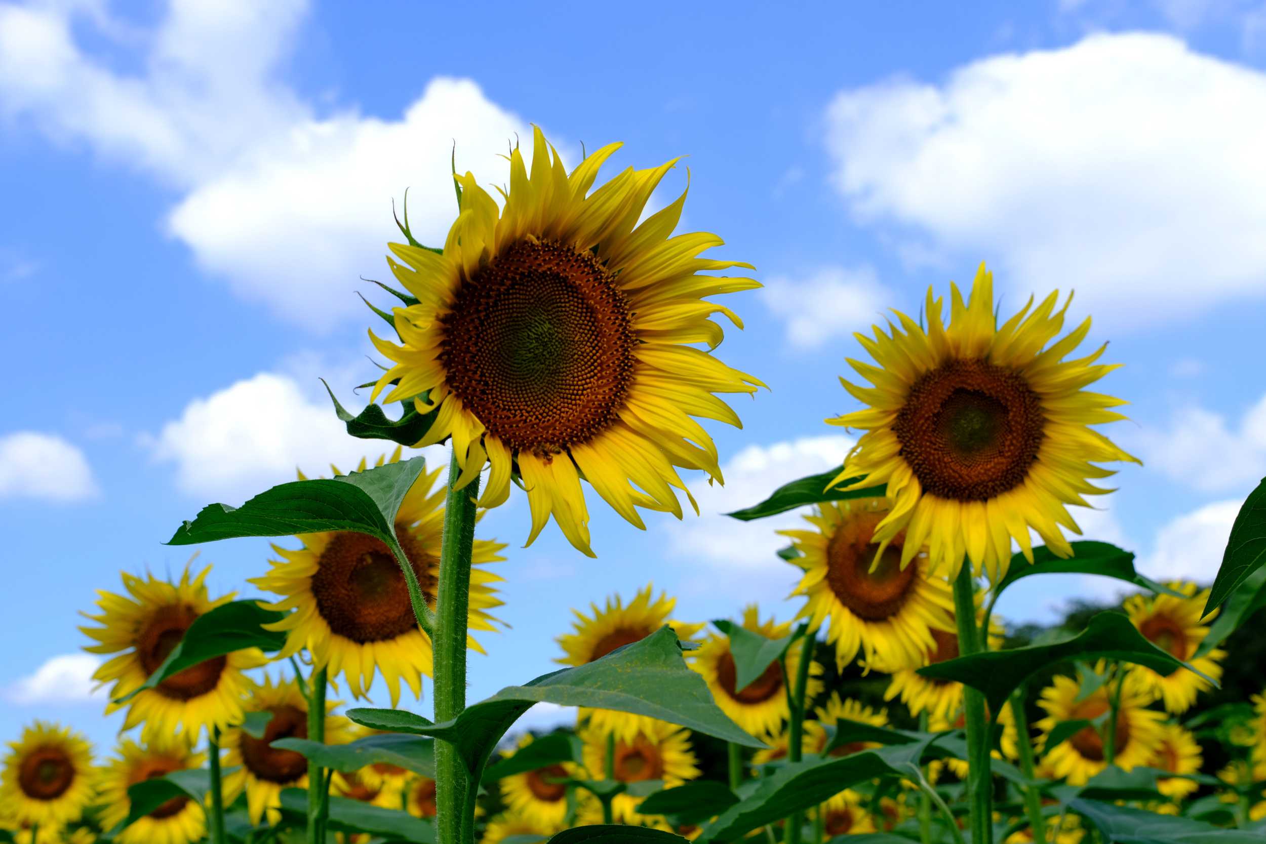 向日葵の二回目です。前回と同じ日(8月初旬)の撮影です。どこまでもつづくヒマワリの黄色が目にしみました。暑くても青空の日が向日葵には似合います。「日焼け」を連想。きみだけ遅いって?「待ってろよー」夏空と雲に見守られて元気げんき。どこまでもどこまでも。緑と黄色と青と白で描かれた世界。見下ろしてみた。向日葵は私の「希望」。