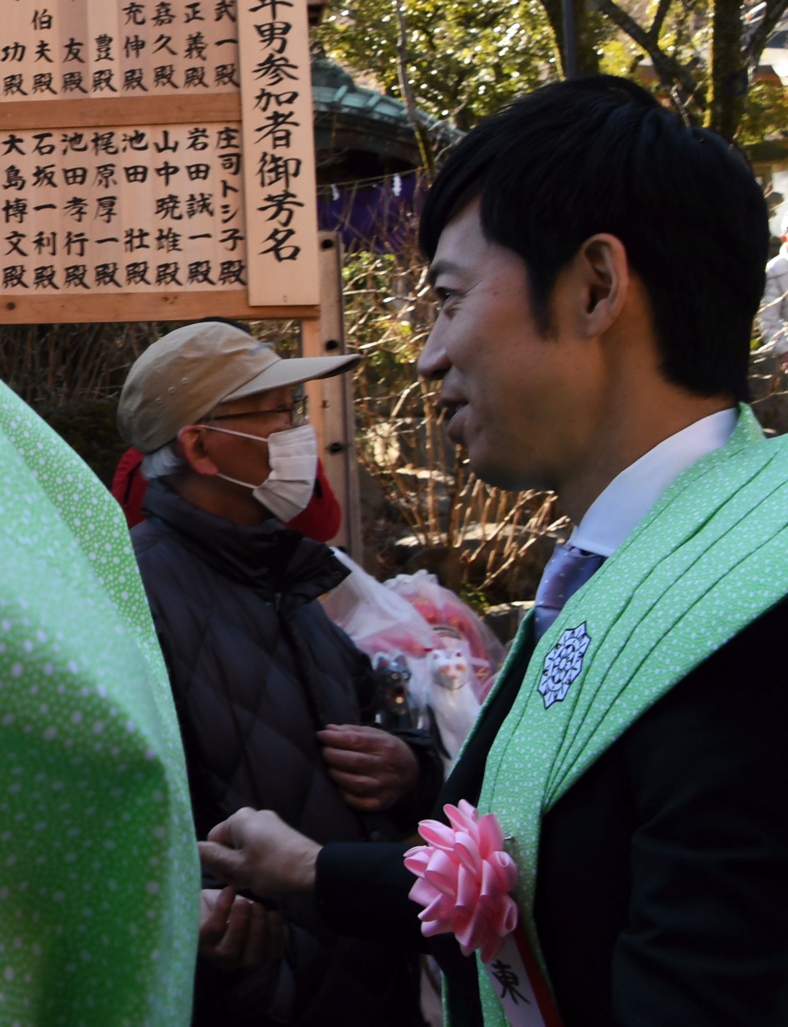豆撒き式に行く前に年男?さんたちが通ります。