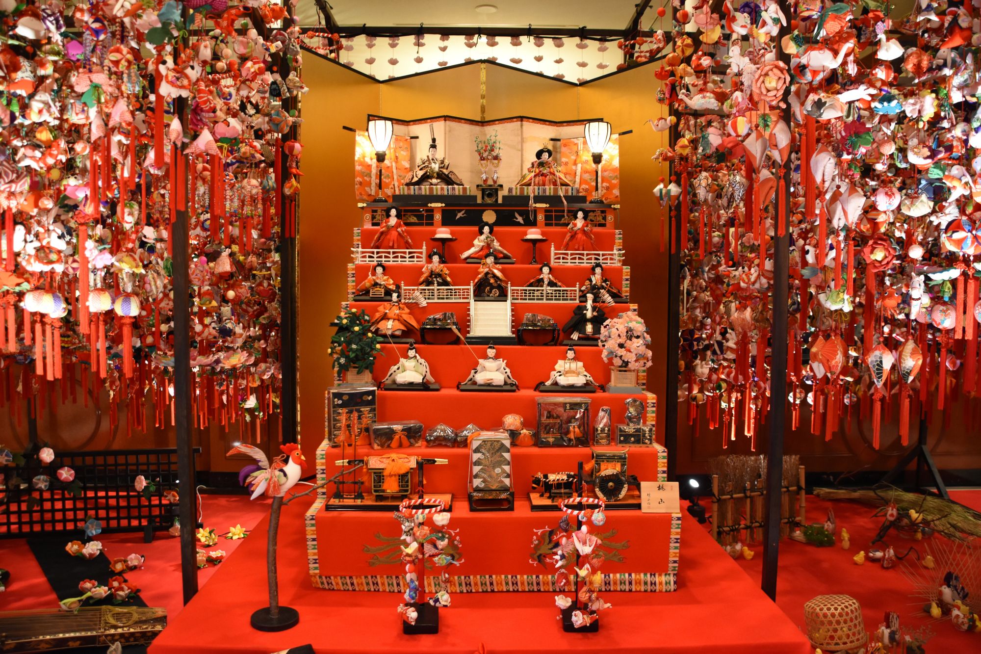 ホテルのロビーにはすごい数の吊るし雛と段飾りのおひなさまが。