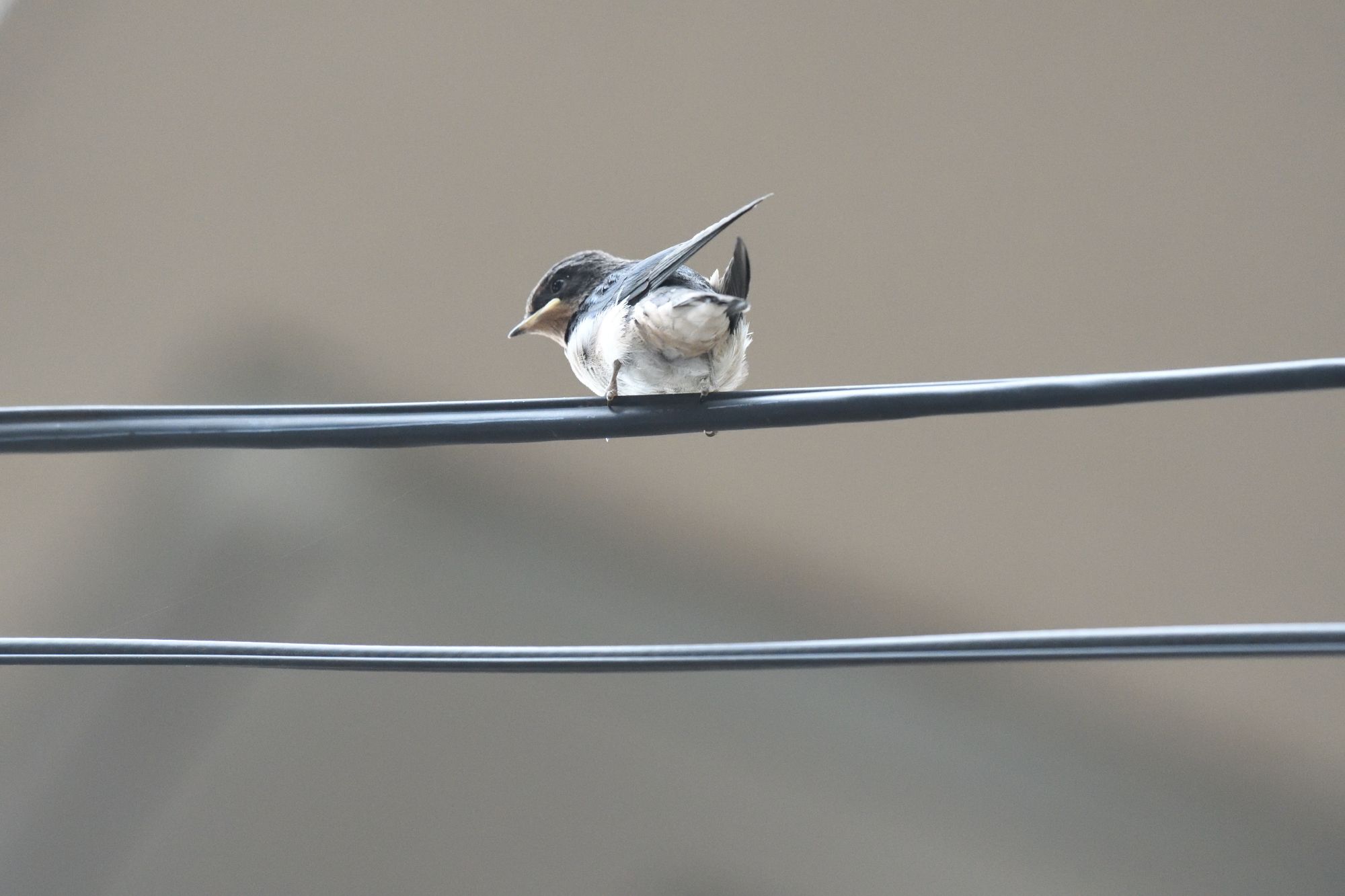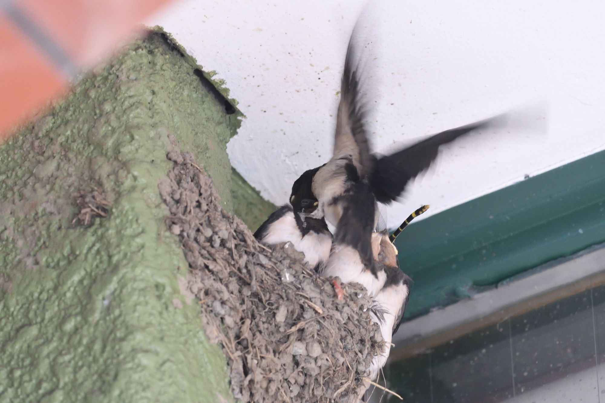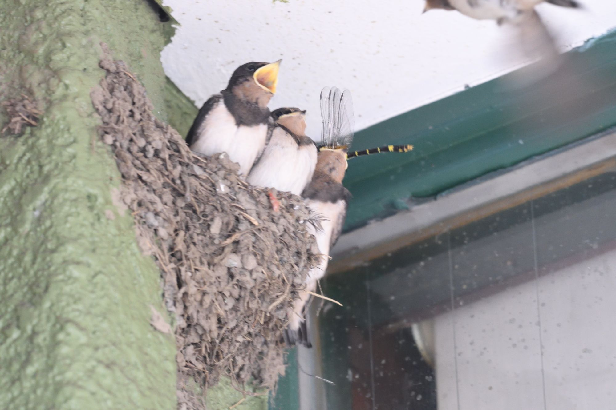 右上に写っているのはあわてて巣に戻って来た電線にいたヒナです。