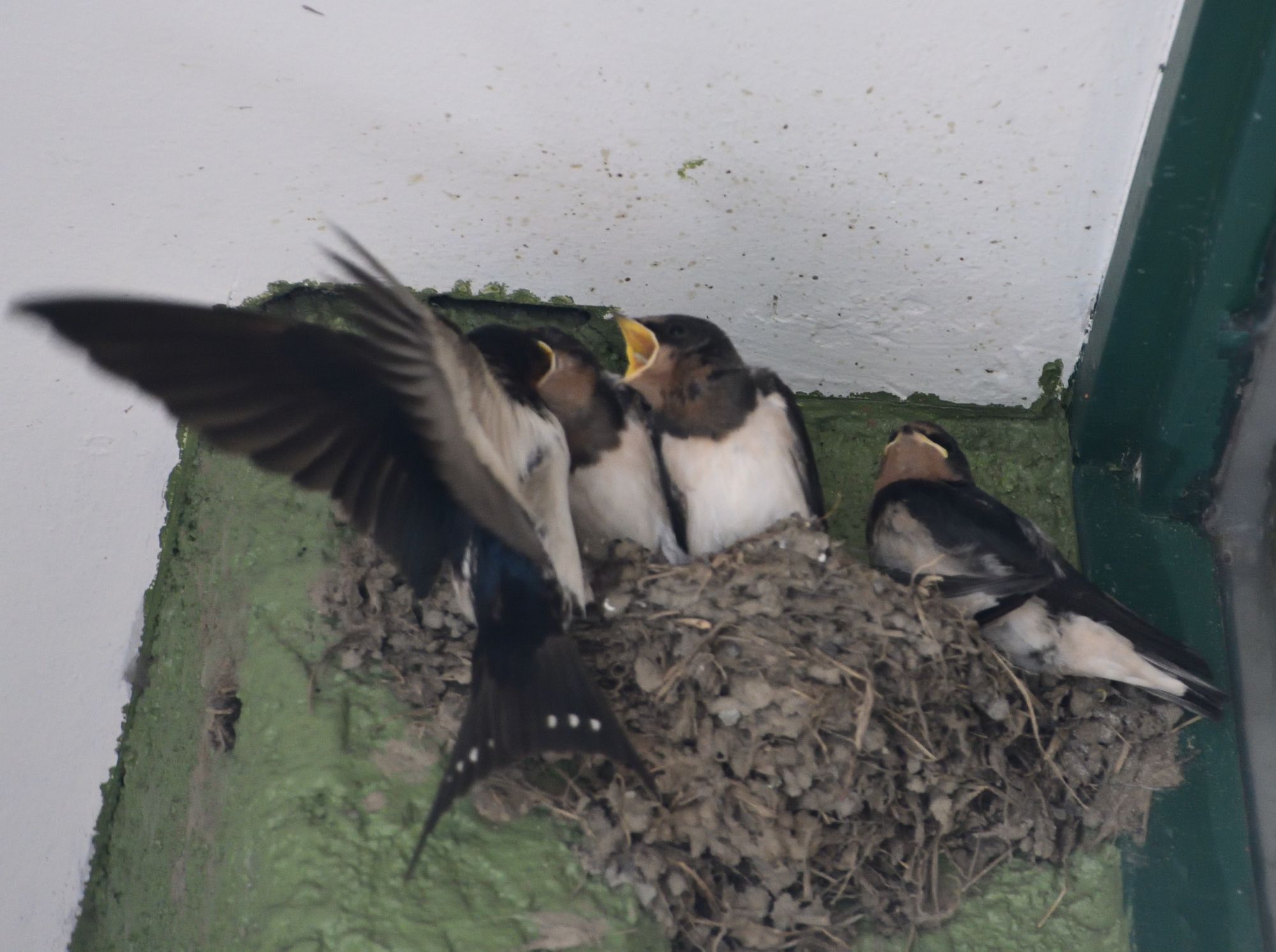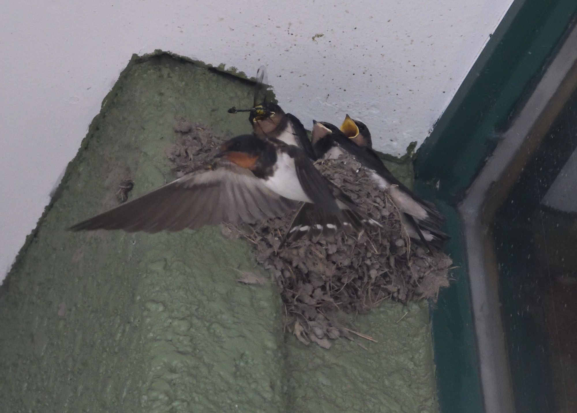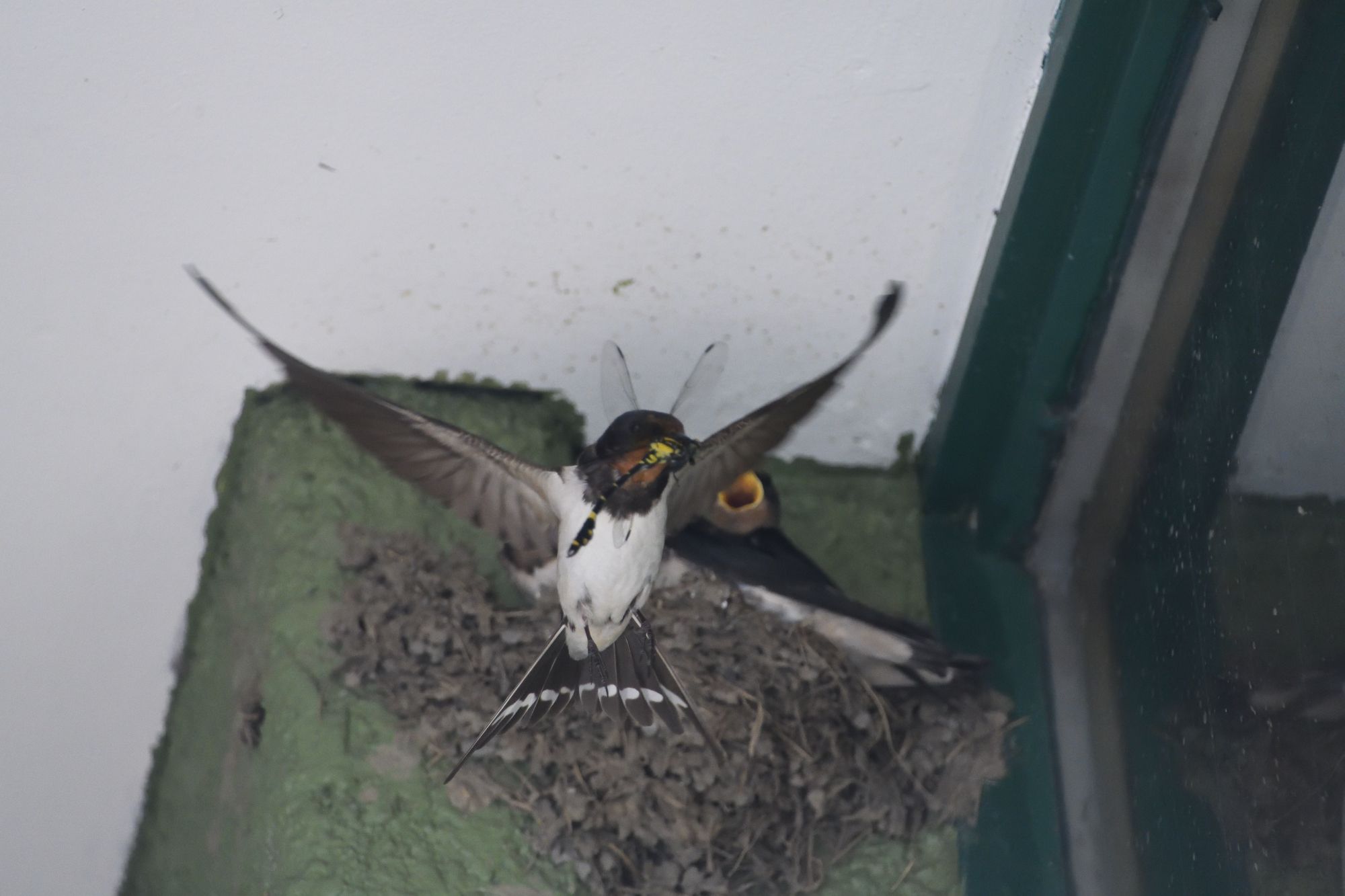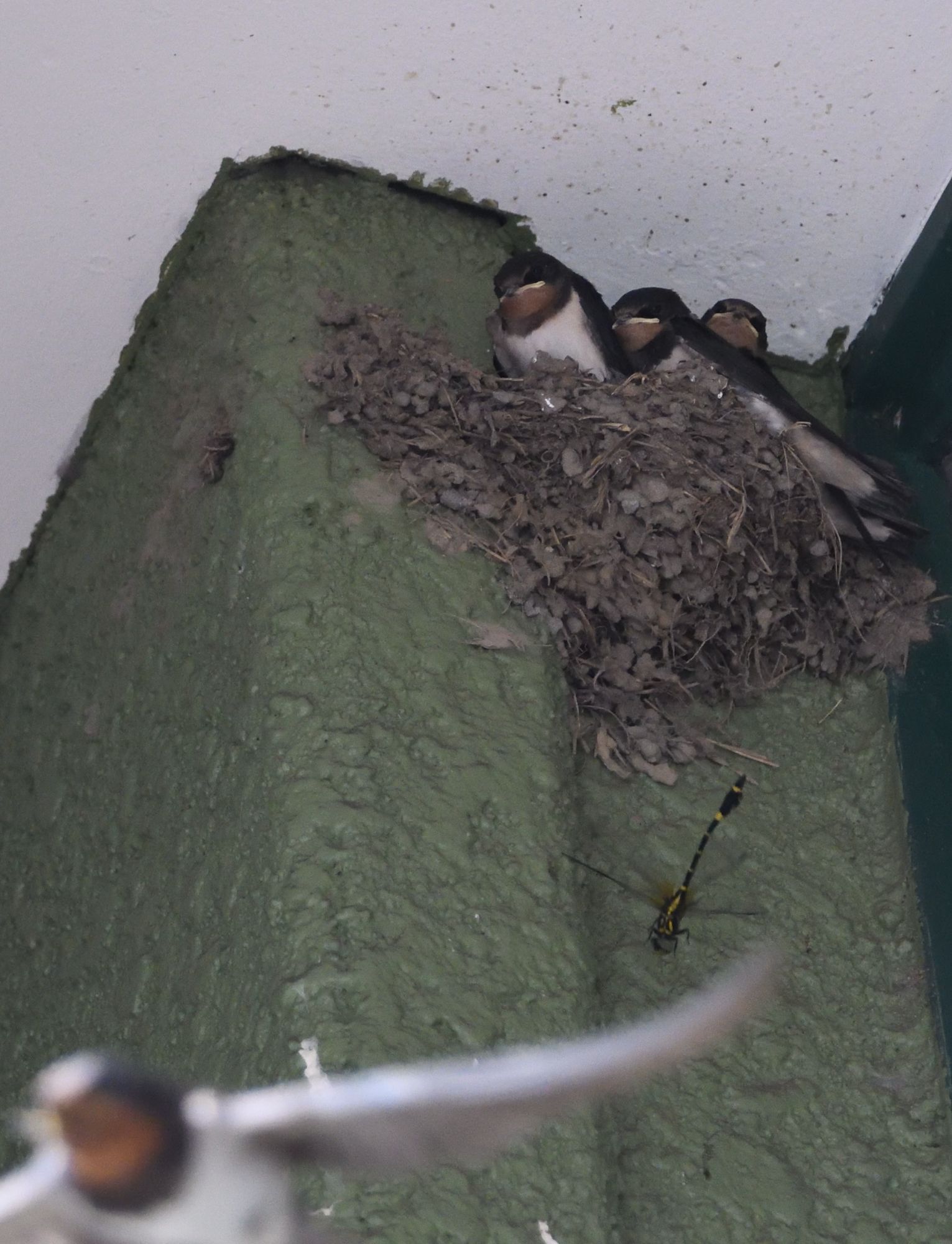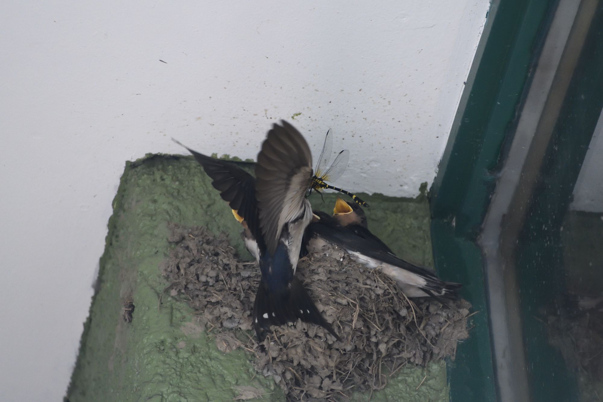 しかし、すぐにひとまわりして巣に戻り、無理やり?トンボを一番左の子に与えて帰りました。