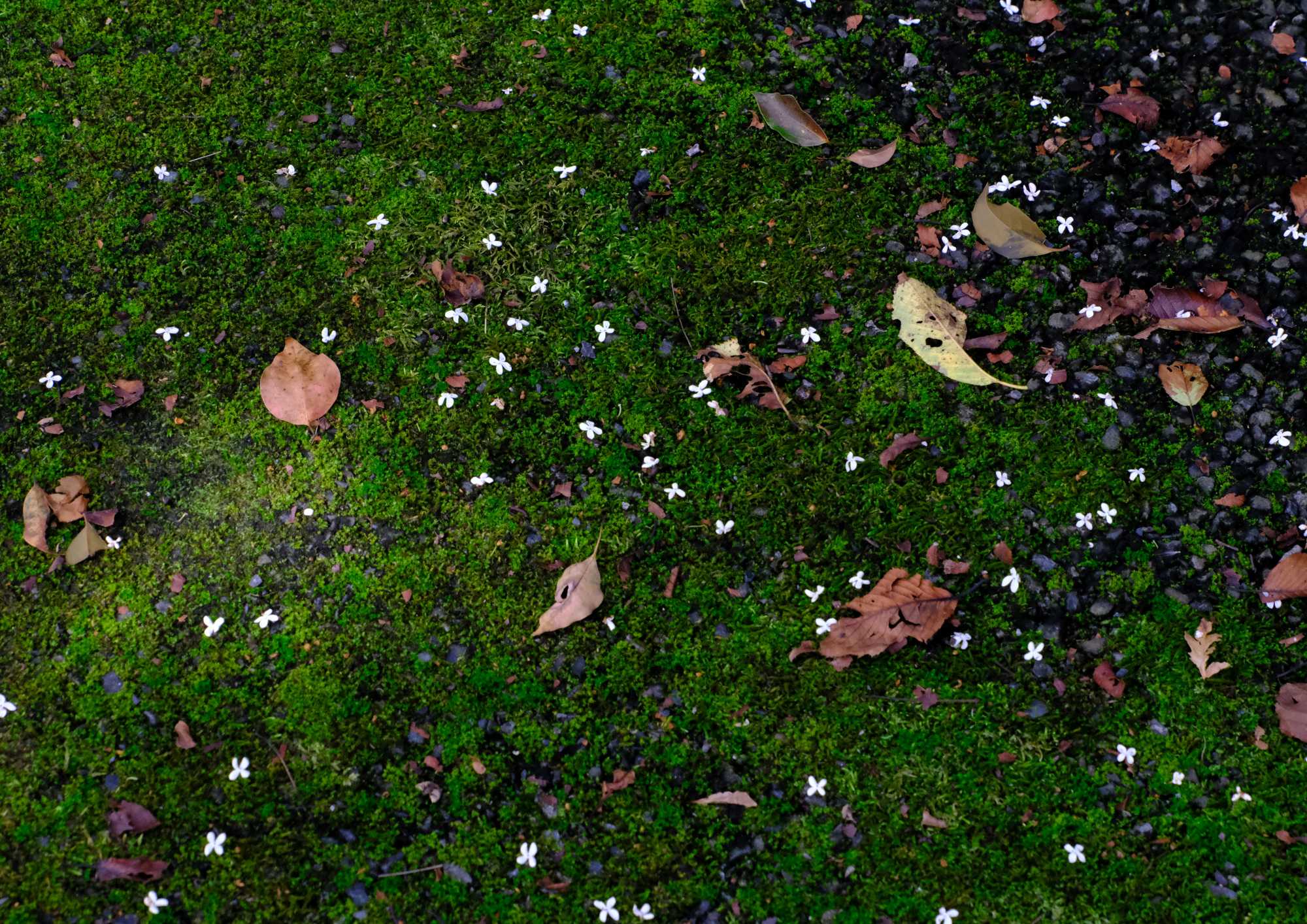 苔の上に散る。