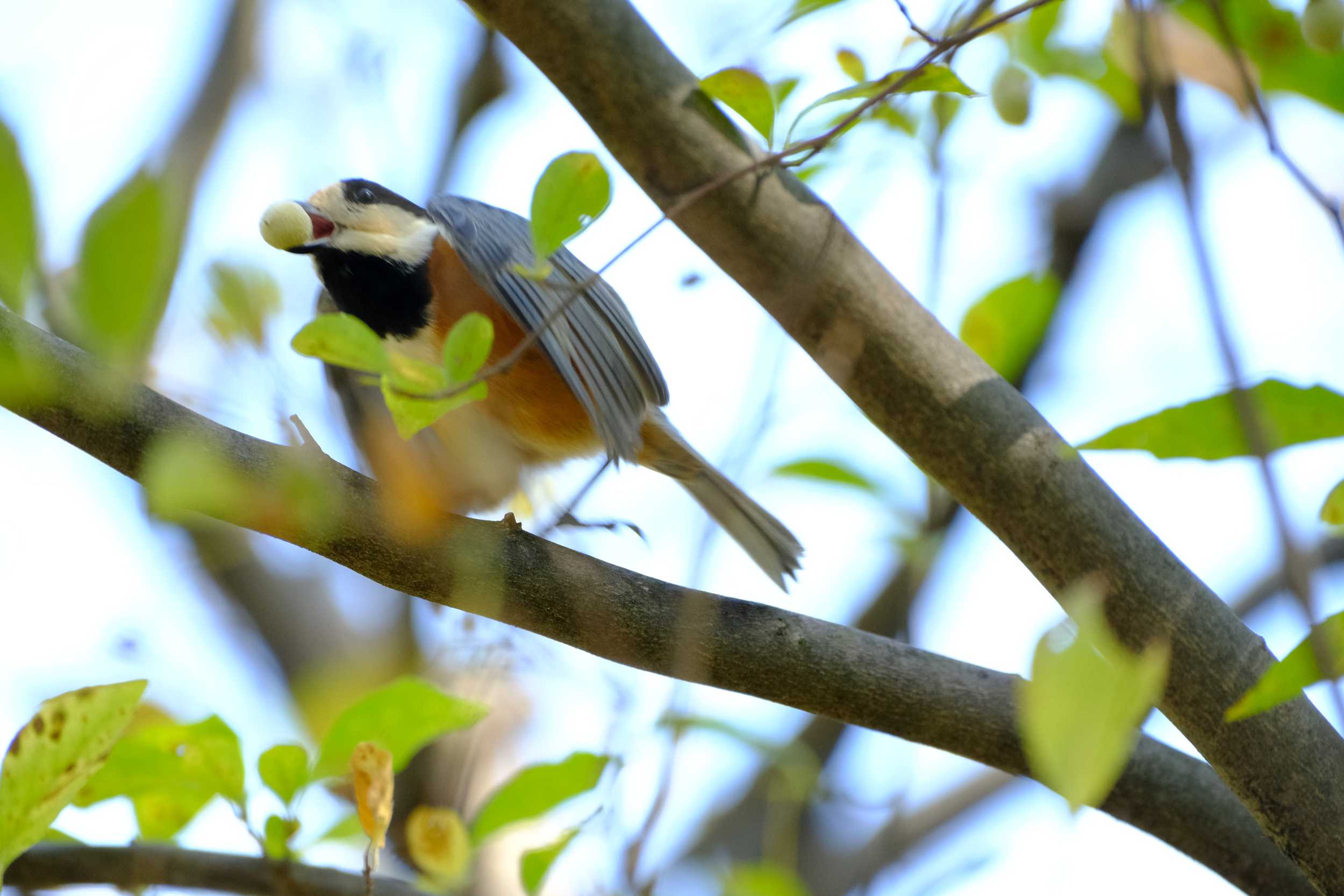 その皮を足でおさえ、嘴で器用にはがして捨てて中の黒い実を取り出します。