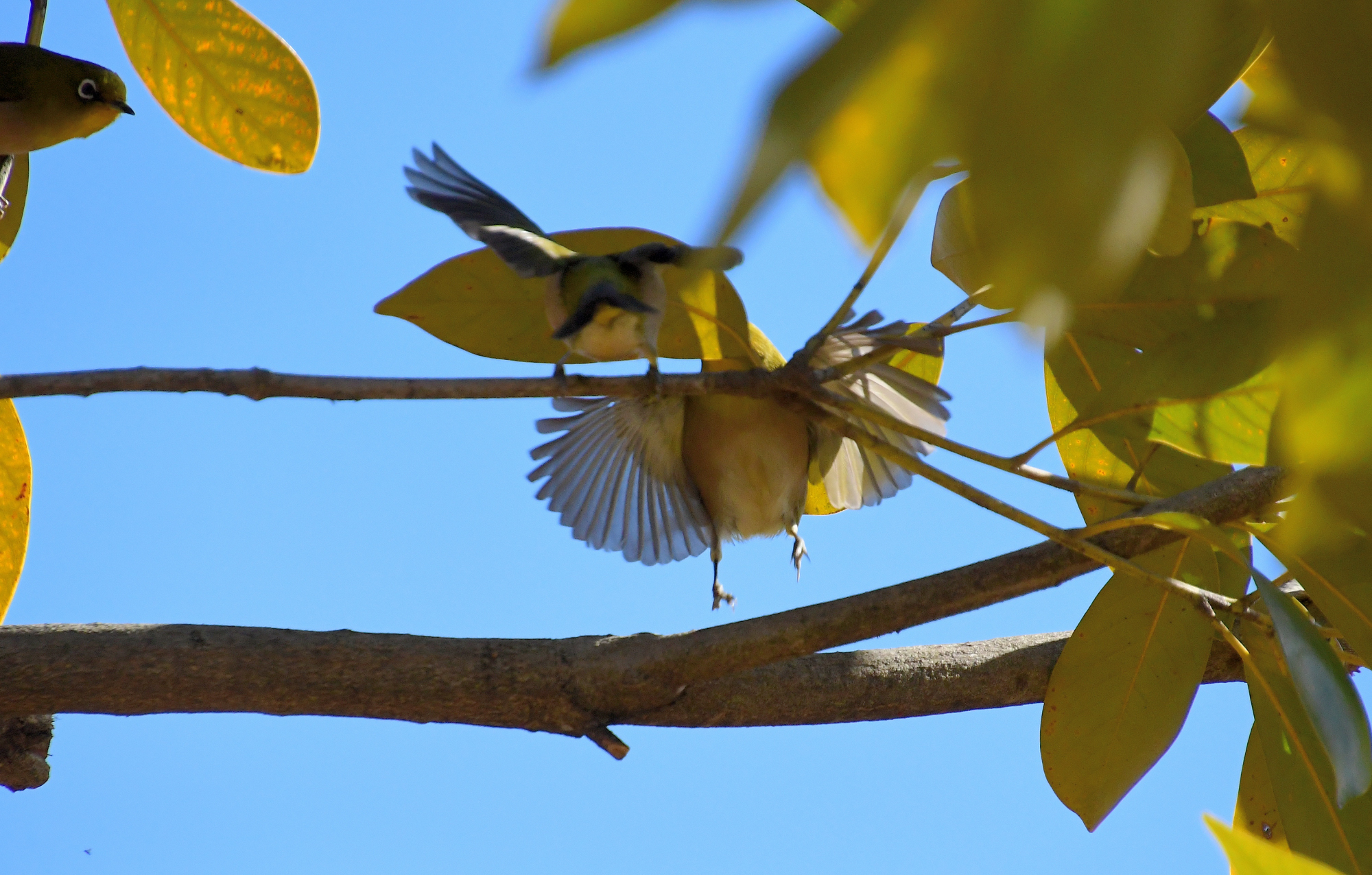 どのメジロかわからないですが、花の中で激しい空中戦。