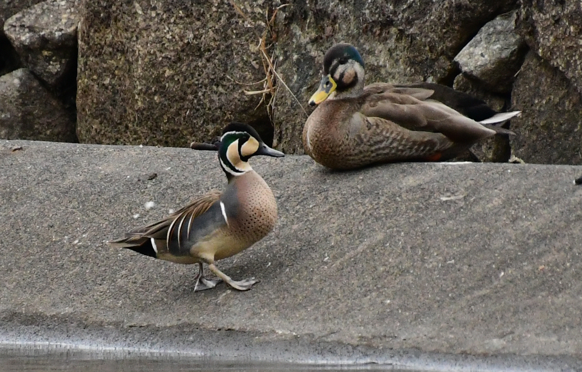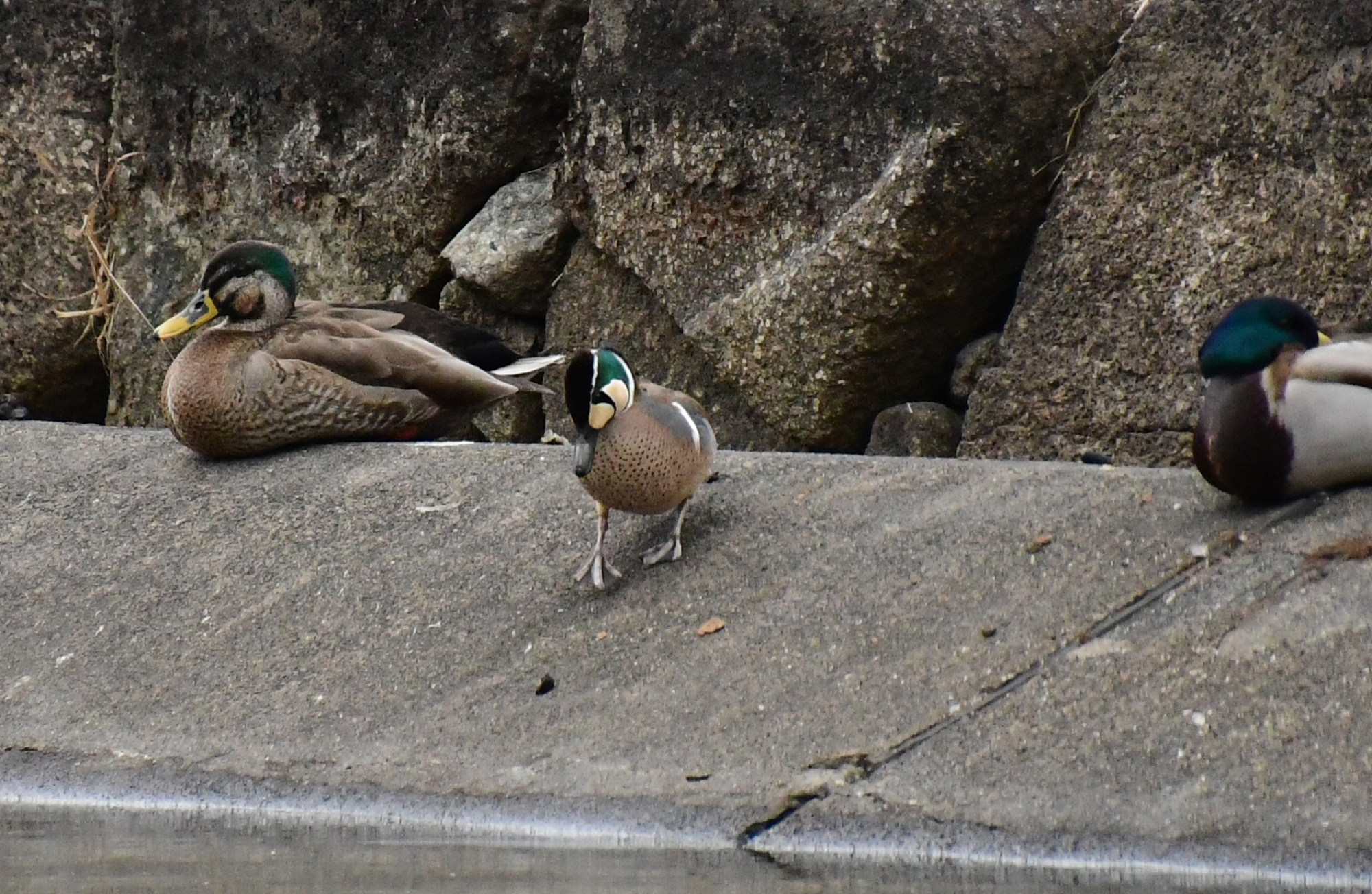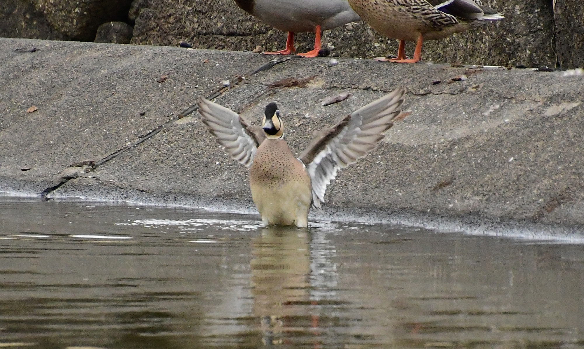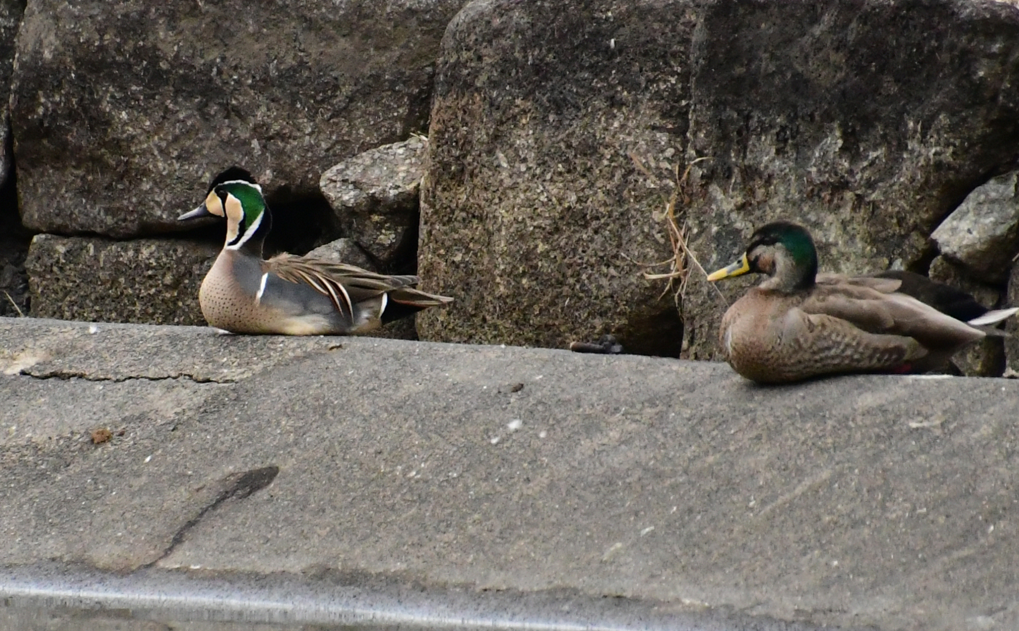 隣で寝ていた(たぶん)通称マルガモさん(マガモとカルガモの交雑)を誘ってみました。