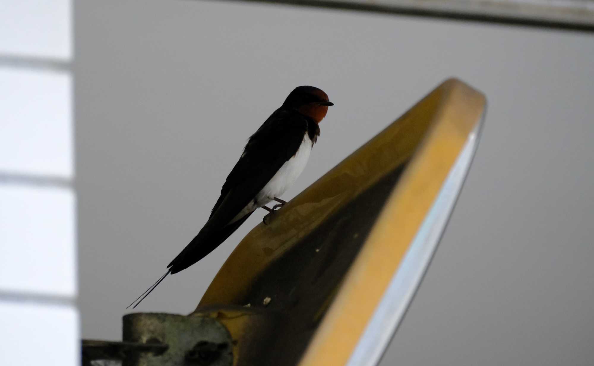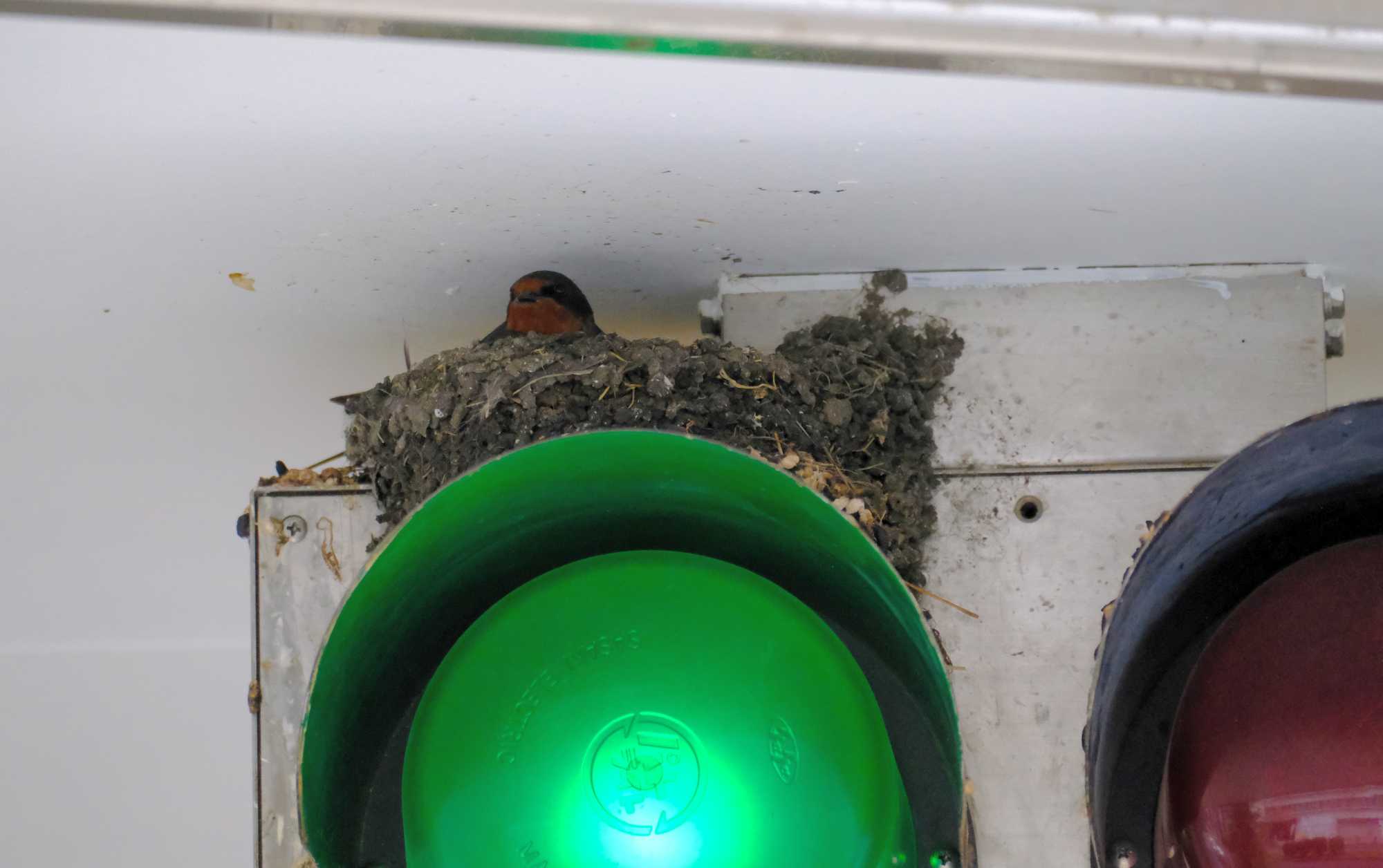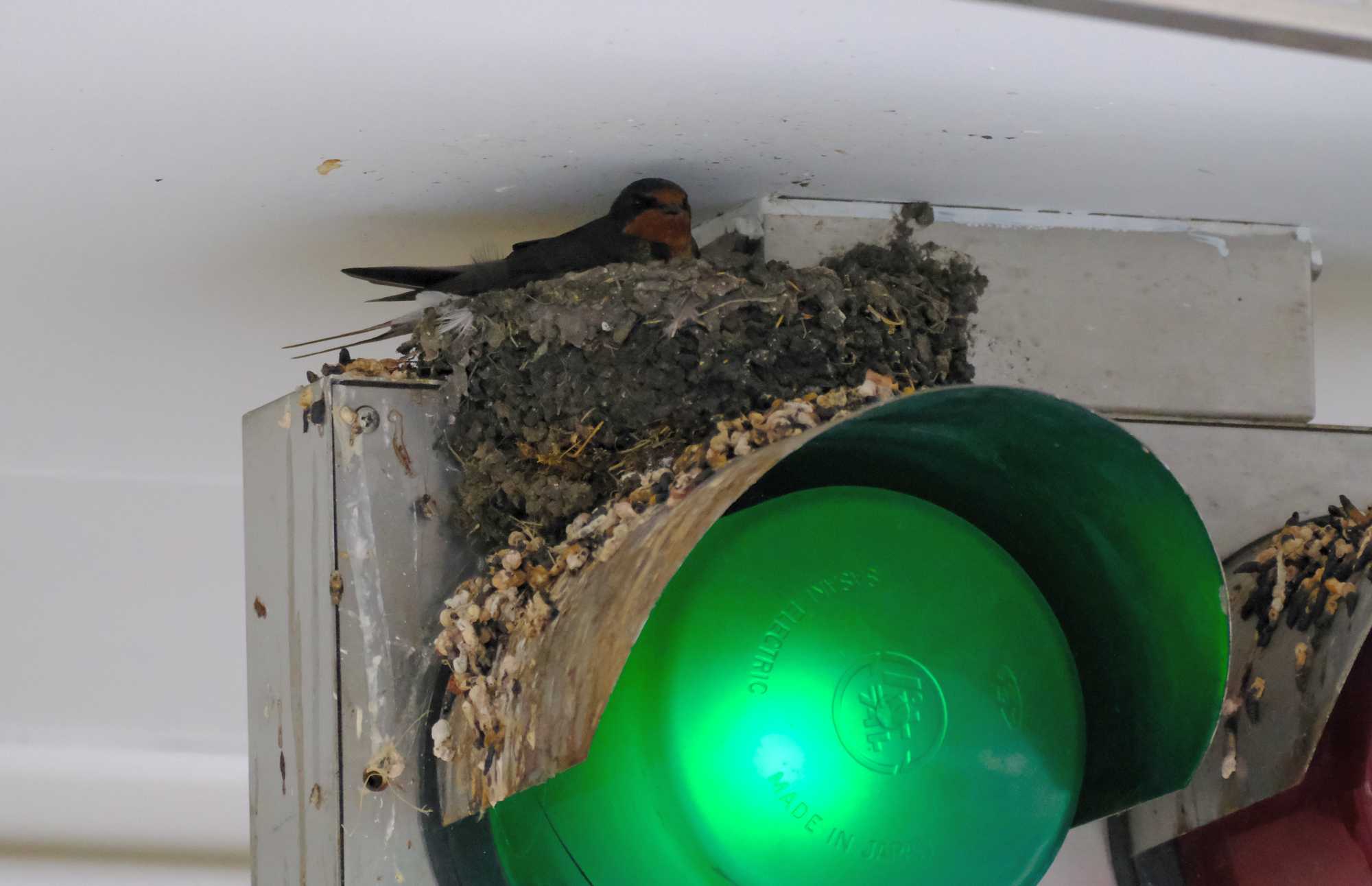車の出入りのための信号機がついていますが、その信号灯の上にツバメが営巣していました。