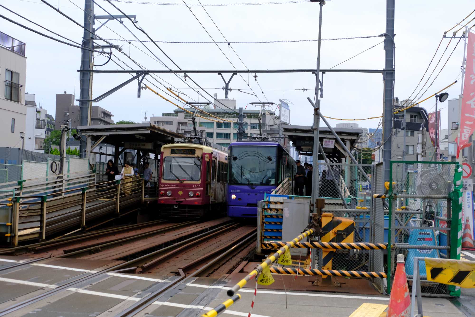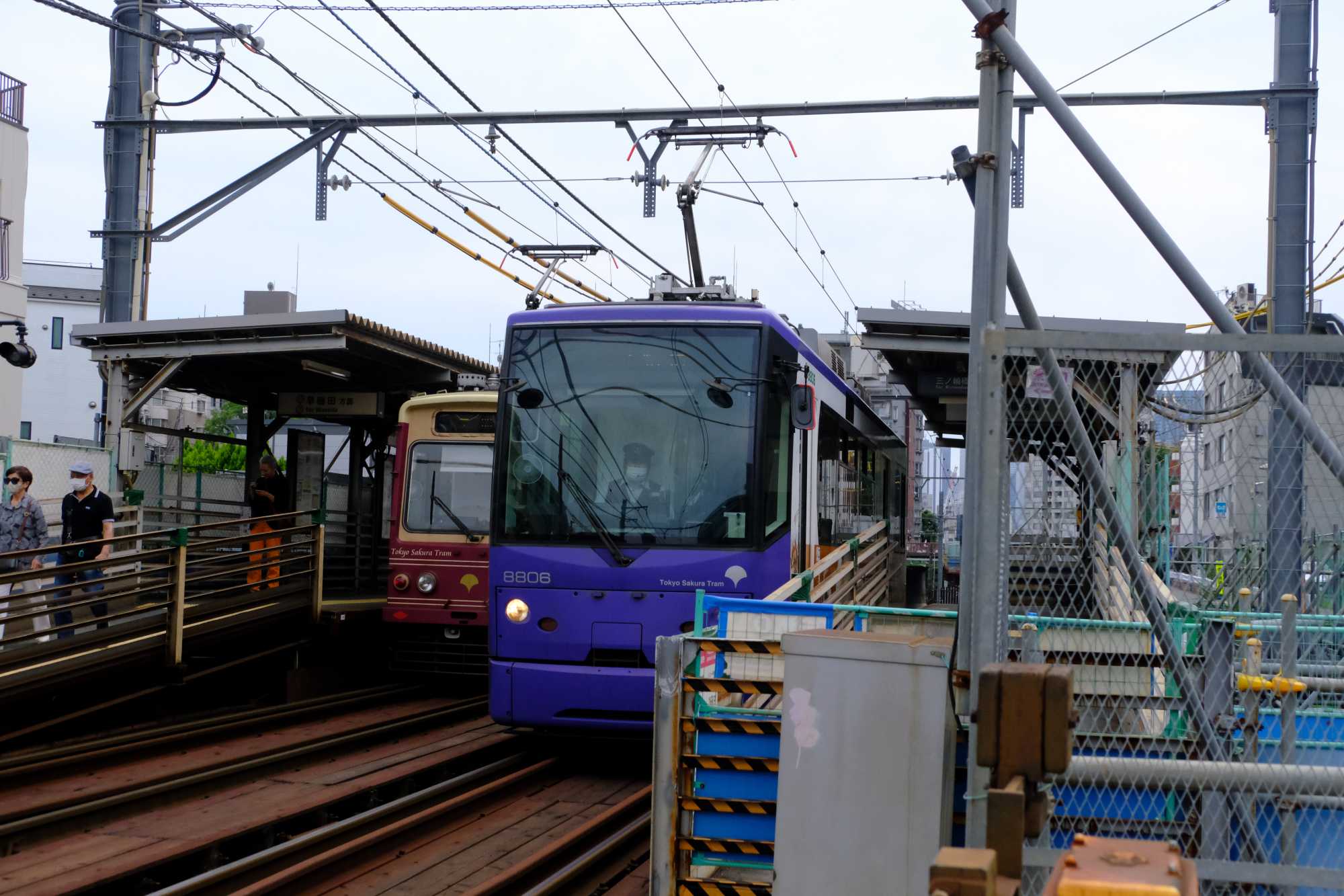 都電荒川線の「鬼子母神前」駅に上りと下りの電車が止まっています。