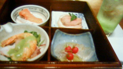 今日の夕食は、職場の某部署所属のお嬢さんたちとお食事会でした。某部署の新人さんの歓迎会というのがもともとの目的だったのかな?ちなみに、赤うさぎが普段暮らしている部署です^^お呼ばれしたので、ホントは微妙に部外者(でもよく入り込んでいる?)なのですが、ウキウキと出かけてきました。洋風割烹なのかな?のお店です。冷製スープとかデザートとかは、写真忘れました…携帯を横に置いていても撮影を忘れちゃううさぎって…。しかも、手ブレしないように撮影しているのに、今一つピンボケだし…う~ん。携帯の手ブレ機能が今一つなのか、うさぎの手の固定が今一つなのか…。美味しそうに撮れているので、それで勘弁してくださいませ~。お腹いっぱいで眠いです。えへ。