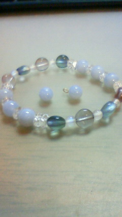 セレスタイトという薄水色の石がメインのものです。怒りを鎮め人間関係を良好に保つんだとか…。じっと見ていると、思い出した!所有しているピアスのパーツにあるわ、この石!
