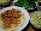 ・ウィンナー入りパスタ(ウィンナー炒めて、トマトソースを解凍して入れて、暖めました)・茹でたブロッコリー・サラダ(春キャベツとコーンとシーチキンをマヨネーズで和えました)