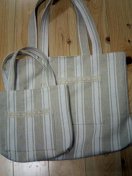 ↑キッチンマットの残りで作ったトートバッグ大小です。大は、表に1個ポケット付けて上の方にレースを付けて、内側両面にポケット付けてウサギのアンティークリボンを付けました♪小は、持ち手にリネンテープを付けて、表側両面にポケットを付けて、片方だけレースを付けました。 フリマ出店用のエプロンです。ストライプのデニム生地を横に使い、ポケットを4個にしてます。横にイカリマークの生地を使ってタグを付けました。ポケットの回りは、リネンテープで補強しました。ウエストの紐も、リネンテープです。福重のフリマで、初めて使いましたが、ポケットたくさんあるので、使いやすかったです エプロンの残りで、うさっこが作ったコースターです。ナチュラルキッチンの糸を使って、手縫いでチクチク縫ってました久しぶりに、自分用のを、作りました・・・自分のだから、かなり適当になりました(^^ゞstoryさんが、新店舗オープンしたとお聞きしたので、今日行って来ました(^^)/以前よりお店も広くって、ますます素敵になってました♪(お店の写真を取り忘れました^^;)その後、「肉が食べたい!」とのうさpapaの希望で、スタミナ太郎へ行きました。今日の夕食☆お茶漬けと、冷蔵庫の残り物・・・(^^ゞ昼間食べ過ぎて、他に入りませ~ん今日の『うさ』☆皆で「ただいま~♪」って、帰って来たら・・・目を吊り上げて、怒ってます・・・今夜は、皆いるから、遊んであげるから・・怒って、うさpapaを、噛まないでね・・・(^^;)