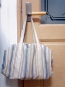 うさっこ用のバッグ肩掛けバッグです☆麻のストライプの生地を使いました。大きな巾着袋作って、端っこを少し折って(ここはミシンはかけてません)×に縫いとめました(^^)グルッと1本の麻テープで、縫って出来上がり♪ 自宅用のキッチンマットです☆インド綿を半分にカットして、長さが足りない分は足して、上からレースを縫い付けました。乾きやすいように、裏地は付けてません。