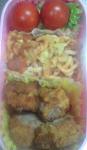 今朝のお天気は、今日のお弁当☆・鳥天(作って冷凍)・ナポリタン(ベーコン、キャベツ入り・作って冷凍)・レタス・庭のプチトマト(下にマヨネーズ付けました)・ご飯は、鮭ワカメのフリカケ、パラパラしました