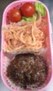 今日のお天気は、今日のお弁当☆・ハンバーグ(作って冷凍)・ナポリタン(作って冷凍)・レタス(間にマヨネーズ付けました)・庭のプチトマト・ご飯は、