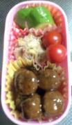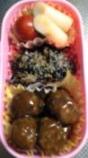 今朝のお天気は、今日のお弁当☆・ミートボール(レトルト)・ヒジキの炒り煮(人参、油揚げ入り・作って冷凍)・レタス・庭のプチトマト(下にマヨネーズ)・チーズかまぼこ・ご飯は、鮭ワカメのフリカケふりました