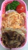 今朝のお天気は、今日のお弁当☆・牛肉と玉ねぎの焼肉のタレ、炒め物・ナポリタン(作って冷凍)・ブロッコリー(茹でて冷凍)・庭のプチトマト(下にマヨネーズ付けました)・ご飯は、鮭ワカメのフリカケふりました