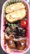 今朝のお天気は、新学期が始まって、うちの前(通学路です)も、にぎやかになりました・豚肉の肉巻き(作って冷凍)・ヒジキの入り煮(作って冷凍)・出し巻き卵(めんつゆ入り)・庭のプチトマト・ご飯は、紫のフリカケふりました