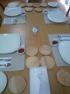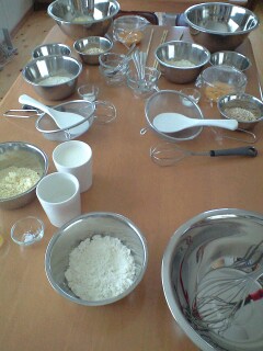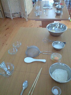 今日のお天気は、台風。福岡より、だいぶ上の方を通過するみたいです。雨風です。突風がたまに吹きますが、今のとこは、そんなにひどくないですpm13:00昨日は、月一ご参加の大人教室の皆さんでした。試食テーブルのセッティング調理テーブルのセッティング(手前は、焼く前の、チーズ入りスコーンです)まだ、私だけなので、静かです^^オートミールクッキー製作中です♪製作終わったら、今から楽しい試食ですトルティーヤ・ソース・野菜たっぷりのハーブ&ウィンナー入りスープ焼き立てのチーズ入りスコーンは、全部で12個です。トルティーヤは、全部で8枚です。試食中に、オートミールクッキーも出来上がりました。全部で、80個です。今回、4人でのご参加なのでお一人スコーン3個・トルティーヤ2枚・オートミールクッキー20個です。来月から、新しいのに変わります。(ただ今、試作中です^^;)☆大人教室・親子教室(11時開始~約3時間くらい、一日1グループのみです)8月平日予約受付中です。☆夏休みお菓子教室8月18日・20日どちらも、午前10時開始~・午後1時開始~(製作・試食時間1時間半くらい)予約受付中です。
