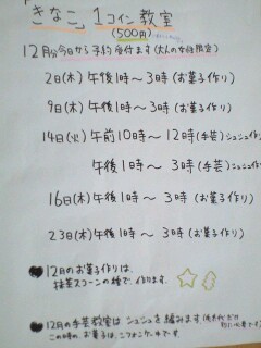 今、家の門のとこに、『自宅でフリマ』のお知らせのボードをはってます。昨日は、庭と車庫近くにもはりました自宅でフリマ終わったら、すぐに外す予定です。(きなこ教室の看板は、出す予定はありません)12月から始める『1コイン教室』と『ママさん応援教室』の予約受付は、11月19日(金)から始めますこの日は、『自宅でフリマ』(場所はうちのリビング^^)にいらした方のみです♪11月20日(土)以降は、メールやお電話などからも、予約受付始めます♪※『大人教室』・『親子教室』は、 11月~12月予約受付中ですHPは、→こちらブログには、公開してないことも『自宅でフリマ』の時には、ポップで中に掲示します先日の、ダイエー笹丘店でのフリマ出店以降、あんまり製作進んでません後、1週間です・・頑張ります