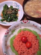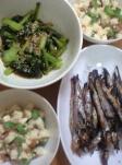 今日のお天気は、今日の夕食☆・シシャモの焼いたの(ちょっと、焦げちゃいました^^;)・小松菜の炒め物・山芋とオクラと納豆の和え物※写真には、ないけど、もずくスープ(お湯入れるだけ)