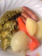 今日の夕食☆・ウィンナーポトフ(コンソメ・ジャガイモ・人参・玉ねぎ・ウィンナー・ブロッコリー・庭のローリエ)※ブロッコリー、ちょっと茹ですぎました(^^;)
