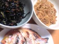 今日のお天気は、ちょっと曇り昨日は、『自宅でフリマ』にたくさんの皆さんに、ご来店&お買い上げいただきどうもありがとうございましたm(^^)m今日は、筋肉痛です(笑)今日痛いってことは若い?今日から、『1コイン教室』予約受付開始です詳しくは→こちら(字が下手で- -;すみません)『ママさん応援教室』も今日から予約受付です。『大人教室』『親子教室』は12月分まで、平日予約受付中です。お問い合わせ・お申し込みは携帯アドレスにご連絡お願いしますm(^^)mフリマでお買い上げしていただいた方には、携帯アドレスお渡ししてますそれと・・・昨日の『自宅のフリマ』来ていただいた皆さんに感謝の気持ちを込めてご来店の方(+その方のお友達)限定で近日中に「1コイン無料お試し教室」考え中です(^^ゞ詳しく決まりましたら、また書きますね♪昨日の夕食☆・豚汁(豚肉・人参・大根・ゴボウ・糸こんにゃく・揚げ豆腐・サツマイモ)おとといの夕食☆・アジの塩焼き・白菜の中華風酢の物(白菜・レーズン・ごま油)・鳥レバーの甘煮※写真には、ありませんが、永谷園のマツタケのお吸い物