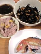 今朝のお天気は、まだ暗くて分かりません・・お陰様で、うさっこ合格しましたホッとしました・・昨日の夕食☆・鯛の塩焼き・炒り煮(ひじき・油揚げ・いんげん)・モズク酢・栗の炊き込みおこわ(冷凍しておいた栗・小豆の水煮缶・もち米・塩)