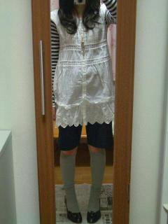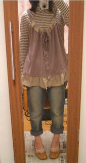 久方ぶりの更新でございます。最近バタバタしてて、ちょいと疲れたけど充実した時間を過ごせた気がする~。とっても満足気分爽快さっだけど、何かダラダラしてたらいつの間にかこんな時間になってたぁぁ眠い・・・でも、ブログは書く!ってことで、サクッと書いちゃうよ~。今日・・いや、もう昨日だけどとにかく、こんなカッコしてましたそういえば・・・。家に帰って鏡を見たら、口に虫が張り付いてて大変ショックを受けたのでした!前にもこんなことあったけど今日は全っ然、気づかなかったんだよ。いったい、いつからくっついてたのー。虫くっつけたまま、外ウロウロしてたんだろうか・・・。だけど、虫さんもグロスのせいで、身動きとれなくなって(?)そのままお亡くなりになったのかと思うと、何か不憫だよね・・・。・・・悲しくなってくるから、この話はもうやめよう。さてさて、今日の格好写真に撮ってたらいつぞやの服装を思い出して、ついでだからパシャリと撮ってみた決して更新が面倒だから、まとめてアップしよう☆とかいう浅はかな考えからではないのですよ!?