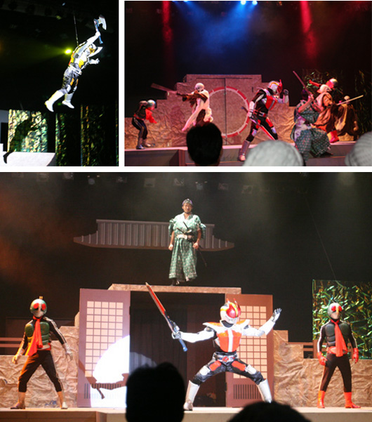 最近、なかなか更新が追いつきません~。皆さんのところにお邪魔しても読み逃げばかりですいませんというわけで、やっと年末のお話なんですが・・・。えいみーちゃんの一家と一緒に、るりっちとちゃあちゃんと東映太秦映画村に行ってきましたゆっき~パパもちゃあちゃんも京都人なのに、パパは、小学生以来・・・、ちゃあちゃんは生まれて初めての入村です・・・といっても目的はやはりヒーローショーでした・・・!この日はるりっちの大好きなゲキレンジャーではなく、仮面ライダー電王ショーです↓(ほーちんさん、間違えてました、ごめんなさい・・・) そう言えば1年くらい前は、友人の子供が戦隊モノに必死になっている姿を見てるりっちもこんなんなるんかな~・・・と、すこしぞっとしていたのですが・・・。今ではパパも一緒になってみています・・・。るりっち、電王ショーでも機嫌良く見ているな~と思ってふと1歳1ヶ月のえいみ~をみると↓↓↓ なぜかるりっち以上に大喜びか~~わいい~~~!!そのあと、電王と仮面ライダー1号2号と記念撮影↓ ゲキレッドもなぜか登場!! るりっちのシャツとズボンが多少ジジクサいのは、見なかったことに・・・映画村楽しそ~、電王ショーおもしろそ~と思っていただけたらポチ~~ッとお願いします!!↑ひと~つだけぽっちんしてぇなぁ!