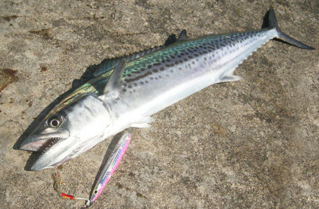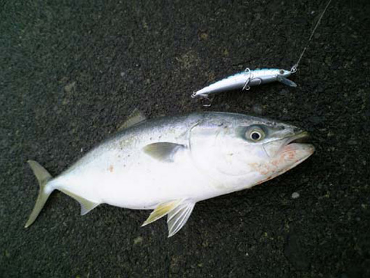 2ヶ月ぶりの釣行です!今回は平日に一人で出撃・・・ 24日の夜に出発していつものように車中泊するつもりだったんですが、予定変更して25日の早朝に出発・・・。いつもの敦賀の有名ポイントに7時半に到着しました ↑すっかり朝です・・・。天気もいいし今日はぽかぽかと気持いいかなぁっと思いつつ、防波堤を歩き出すと、風がけっこう強い・・・。500メートルもある防波堤を風に苦戦しつつ、ジグを投げながら進んでいきます・・・。オーナー針 撃投ジグエアロ 60g ピンク↑こんな鉄のかたまりを小魚に見えるように動かすんです反応が無いなあ、しかもかなり寒いなあと思いつつ防波堤を3分の1ほど進んだ所で前方からどこかで見た方が・・・。敦賀の釣りブロガーの大ボス、敦賀湾ソルトウォーターフィッシング研修生のリョウさんです・・・。リョウさんは出勤前釣行のため、これから帰られるトコでした!なんと墨族日記のあおりんさんもおられるということでリョウさんにご紹介いただき、初めましてのご挨拶・・・ おかげさまで爆風の中、楽しい時間を過ごさせていただきましたしかしながら、ワタクシのジグにはコツンとアタリがあったきり、無反応・・・ ところが隣でフツ~に、投げては巻いているだけのおじさんのジグに、な、なんと、ひとつのジグに二匹のサゴシが・・・。こんなの初めてみましたしかも1匹はでかいし・・・。しばらくすると、あおりんさんも釣ってるし・・・。まわりでもポツポツと釣れてるし・・・。ワタクシ、またもボウズ神復活でしょうか・・・。結局、あおりんさんは2匹をゲットして、12時半頃に撤収・・・。別れ際に「逆転のビックワンを釣ってくださいね」なんて声をかけてくださいましたが、ワタクシはほぼあきらめモード・・・ 防波堤を少しずつ根元へと戻りながら、もう終了しようかなと思ったその時、かすかなアタリが・・・。んん?ダメか~~!バクッ!!き,きた~~~~~~!!な、なんと突然、自己記録の68cmです70オーバーには届きませんでしたが一応サワラでいいんでしょうか?このあと45cmのサゴシを1匹追加して2時半に終了しました数は釣れませんでしたが大満足の釣行でした。釣り楽しそ~、サワラうまそ~って思った方はついでにポチ~~ッとお願いします!!↑ひと~つだけぽっちんしてぇなぁ!