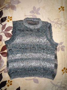 み・え・な・い・・・在庫の糸を使ってベストを適当に編みました。左側の糸と右上の糸で前側を、右の上下で背中側を編みました。前側はなわあみ2本、その他はメリヤス編み。背中側は、裏と表で編みました。う~ん。まったく見えない。