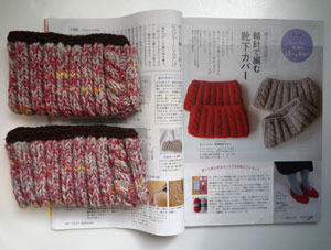 雑誌ハルメク11月号に靴下カバーが乗っていました。輪針で編むと書かれていたんですが、持ってないので普通に?棒針で編みました。半端のハマナカ アルパカリリーと半端のスキートレノで本体を編んで、口?の部分は残ってた茶色の毛糸を使いました。丁度2種類の糸を使い切りました。履き心地は・・・ちょっと大きかったかな・・・でした。中途半端な糸が結構有るので、これを作るのは楽しいかも・・・