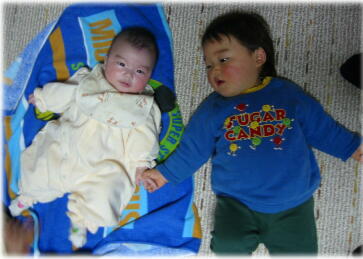 昨日の事になりますが。間もなく4ヵ月になる女の子が遊びに来ました。何と驚いた事に彼女、まるの手を握ってきたのです。まるも満更でもなかったのか、握り返してました。そんな二人ですが、私が彼女を抱っこしたら、まるは凄い顔して固まってしまいました。因みに兄たまはというと、同じように横に寝転んでも全く相手にして貰えませんでした。将来を暗示してるようで不安だ~