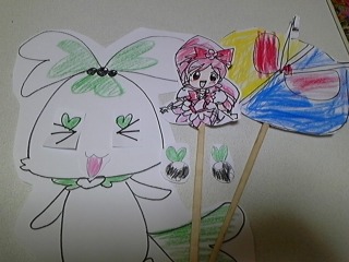 福笑い的某妖精と某赤い女の子と半分こ仮面今日下の子供とつくったもの。割り箸をつけてペープサートみたいにしたら、かなりはまったみたいです。そしてこれが妖精の目を交換したものと、割り箸組のウラ側! 半分こ君は子供が自分で全部作りました。次はドラゴンボールのスーパーサイヤ人を作るんだそうです。はいはい!明日、がんばってね!お母さんは・・・もうしなくてもできるよね!!ね!ね!! ・・・・やっぱ、引き続き・・・・作らされそうな気がします。