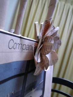 先日の新聞バッグに、同じ新聞で作ったお花をつけてみた。