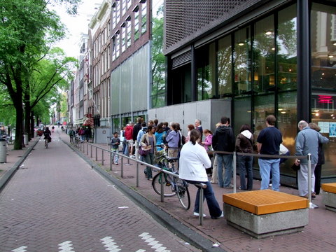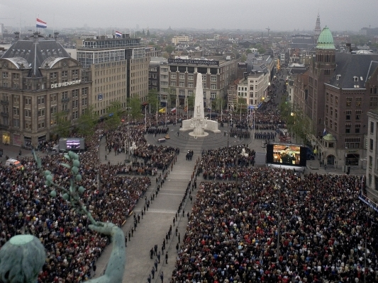 (戦没者慰霊式典:アムスのダム広場) 67年前の5月(1940年)ドイツナチスに占領されたオランダ 1941年の占領下でのスト地下レジスタンスユダヤ人狩り(ユダヤ人だけでも10万人以上が死んだ)アンネ・フランク一家の隠れ家での生活彼らの逮捕。強制収容所での死インドネシアの日本軍による制圧オランダ人の収容所生活慰安婦にさせられたインドネシア在住オランダ人女性たち1944~45年の飢餓の寒い冬 (都市生活者は食料がなくチューリップの球根やマロニエの実まで食った) (日本式あいさつを強制されたインドネシアのオランダ人たち:レジスタンスミュージアム) (レジスタンスが地下からの新聞発行に使った印刷機:レジスタンスミュージアム) (アンネのお父さんオットーが戦後再婚した相手(ムッティ) の死んだ前夫あるいは息子が描いた油絵:レジスタンスミュージアム) カナダ軍のアムス制圧でそんなイヤな季節が終わるのが62年前の1945年5月はじめ (英雄=カナダ兵と乙女たち:レジスタンスミュージアム) アムスに入る解放戦士カナダのあんちゃんたちに黄色い声を上げ身も心も捧げちゃった乙女たちがいっぱいいたそうだだからカナダ移民が多い ということで明日の解放記念日のイブである今日5月4日が戦没者慰霊の日と定められている午後8時に女王がアムスの中心ダム広場の戦没者慰霊塔に献花し2分間の黙祷この黙祷は全国数百箇所のセレモニーでも同時に行われる人気サッカーの試合だろうと中断してやる よし、2分間くらいオレにだってできる8時になったら黙祷だ我が愛するアンネちゃん(といっても今生きていたら77歳のおばあちゃま)たちの冥福を祈って (アンネ一家がドイツから逃げてきて隠れ家に潜むまで7,8年間住んでいたアパート。3階のレースのカーテンの家) (そのアパートの前の芝生に立つアンネの銅像)