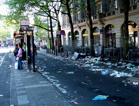 (注:この記事は5月1日に入れるはずのものでしたが、まちがって5月2日に入ってしまいました。あしからず)明日が今日になったのに世界は終わりはしなかったちゃんと陽が昇り昨日と全く変わらず雲ひとつなく地に太陽が降り注ぐゴミの街 170人の清掃部隊と16台の清掃車が昨夜からアムス中心部で奮闘しているのに、今朝の路面電車は未清掃地域を避けて迂回していくさらに夕刻になってもゴミの散乱したままの通りは無数だったこんなクィーンズデー翌日は記憶にない今まではどんなに散乱していても翌日にはほぼ何もなかったかのように街はきれいさっぱり掃除が終わっていたものだ昨日がどれほどの人出だったかがわかる快晴、そして暑くも寒くもない気温20度50万人の人出となった(昨年は35万人)街のどこもかしこも超満員中心部の主要ポイントでは50 m歩くのに20も30分もかかる運河にはボート族が超超満員飲んで踊って・・・DJが乗り込んだ舟もザラ大音響があちこちから響き渡って止むことを知らず・・・街角、橋の上、広場・・・にも数え切れないほどのステージがセットされハウスミュージックがロックが懐メロが・・・・その周りでは老いも若きも踊り狂うあちこちからマリワナの匂いが漂うそれ以上にビールとレモネードが溢れる運河沿いを満喫してフォンデル公園に足が向かう毎年この日に子供たちがパフォーマンスを競う楽しい公園だ今年は人出の割りに目立つパフォーマンスが少ないかな、との印象だったが、でもフラメンコのステキな少女(小型ハープとギターは両親?)や中学2年生くらい(?)のエレキギターとドラムスのロックデュオは光っていた公園の芝生という芝生は寝そべり族に占領されきっている町の中は自転車ではとても無理なので中央駅ウラの渡し舟着き場に自転車を残しずっと歩く延べ20 kmほど歩いたろうか脚が棒になりふくらはぎに痙攣が来たでもこの太陽、そよ風、歓声、笑顔、パフォーマンス、ビール、人々・・・・わけもなく胸が熱くなり涙がにじむこのクィーンズデー、どういうわけかいい天気になることが多いでも今年の天気はその中でも別格。一点の曇りもない一日これほどまでに完璧だと、“明日はもう来ないのでは・・・・” なんて妄想が湧いてきたりもするでもちゃんと明日は今日やってきた。昨日と同じ笑顔で王制とは基本的にはファンタジーだろうが、ファンタジーを持つのが人間さまのサダメこんなステキな一日を演出してくれるのだから王制も悪いわけでもないのかな・・・・まだフラッシュバックが止まない