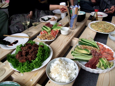 "誕生日おめでとう! 何、25歳だっけ?""うん、プラスちょっとかな" 雨のそぼ降る中、トロピカルケーキを下げてトボトボ辿り着いてみればギャラリー・アンチーク通りの裏世界に名だたるバックパッカーホテル・ハンス・ブリンカーの斜め前さわらちゃんはこんな一等地に(とりあえずの)居を構える アートアカデミーのジュエリー課にいるが進級問題で悪戦苦闘ちょっと落ち込んでいるのかな、と思いきや、なんのなんの自慢のほっぺのツヤは変わりない こんななつかしいメニューでみんなを迎えてくれた集った人たちもほとんどはなつかしい面々 手巻きをいくつか手早く巻いて鶏唐揚げと交互に口に運ぶ 変なものにも箸を伸ばす"何これ?""ちぢみっていうの""へ~・・・""韓国ではねー、雨の日にマッコリ飲みながらそれ食べるの"と作ってくれたかわいいコリアンガール 早々に宴の席に別れを告げると外は相変わらずしとしと雨だった