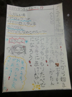 明日はいよいよさくらんぼが夕飯を作る日です。夕方さくらんぼがおもしろいものを渡してくれました。 自分の名前を書いていたので、 写真を撮る時に 書き直してもらいましたが。 学校で新聞を作ったりするので、自分で考えて作ったようです。 しかし・・・・漢字をもっと使って欲しい母でした・・・・素材・SUGAR PINK design・*kico*