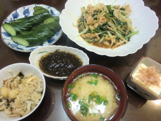 昨日、今日は、さくらんぼ達の夕飯担当デーでした。昨日は沖縄旅行の疲れで胃がもたれ、さっぱりと七味そばを作ってもらい(写真撮り忘れて食べちゃいました) 今日はみんな復活したので普通の夕飯を作ってもらいました。ホタテの炊き込みご飯、えのきの卵とじ味噌汁、豚肉とニラ、もやし炒め。あとは冷奴にもずく。えのきの卵とじ味噌汁は、私が大学生の時、学食の定食でよく出たお味噌汁です。音大は9割が女子、という学食が美味しくないとブーイングがきてしまう環境だったので、うちの学食は美味しいので有名だったとか。300円くらいで、とっても美味しい学生食堂でランチをするのが毎日の楽しみでした今ではさくらんぼ達の大好物でもあります。きゅうりのぬか漬けはジジのお手製。う~~ん、野菜たっぷりでヘルシーです。が夕飯を作っている間に一人のんびりお風呂に入り、出ると夕飯が出来ていて・・・本当~に有り難いです。このメニューは初めてでしたが、とっても美味しかったよ~~、ありがとう~ね!夕飯後、テレビを見ているとバニラがさくらんぼの膝で眠り始めました。だんだんずれていき・・・・・頭が落ちそうなので、さくらんぼが手で押さえてます。とっても安心して眠っている様子です。明日もたくさんお散歩しよ~ね素材・ドットヒバナ/レースCandied design・*kico*