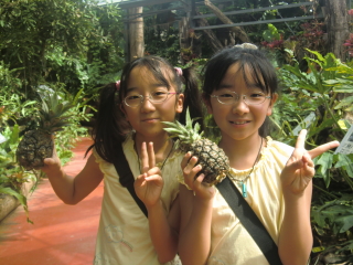 3日目は観光しながら那覇へ。 朝イチでOKINAWAフルーツランド、名護パイナップルパークで観光し、パイナップルの試食をして、一般道で右手に沖縄の美しい海を見ながら琉球村へ。琉球村ではエイサーを見たり、再現された昔懐かしい沖縄の街並みを「暑い~~~~」と泣きごと言いまくりでダラダラと散策し・・・・途中、黒糖工場へ寄ってサトウキビを食べたり(といっても固くて竹のような繊維を噛んで汁を吸うだけですが)ともかくハードでした~~サトウキビ、固かったよね、というと、さすが10歳の歯には固さを感じないようで「え~~??全然固くないけどっ」と切り返され、ちょっぴり悲しくなっちゃいました(笑)ホテルは想像していた以上の素敵なリゾートホテルで、さくらんぼ達は目をキンキラに輝かせ「セレブになったみたい~~~~」と単純そのもの!いいですね~~~少し休んでから夕飯を食べに国際通りへ・・・お友達に教えてもらったサムズアンカーインへ。お店の中は帆船をテーマに、ウエイトレスさんもみんな船乗りの制服です。目の間でパフォーマンスをしてくれ、目にも舌にも楽しく美味しい夕食でしたさくらんぼ達と約束していた現地で出されたものは何でも食べる、という約束も頑張って守り、ゴーヤ、ピーマン、嫌いなサラダも挑戦してました。私もゴーヤは苦手できたが、折につけ出てくるで食べていたら、帰るころには自らゴーヤチャンプルを頼むほどになっちゃいました喰わず嫌いだったのかしら???素材・Fiore design・*kico*
