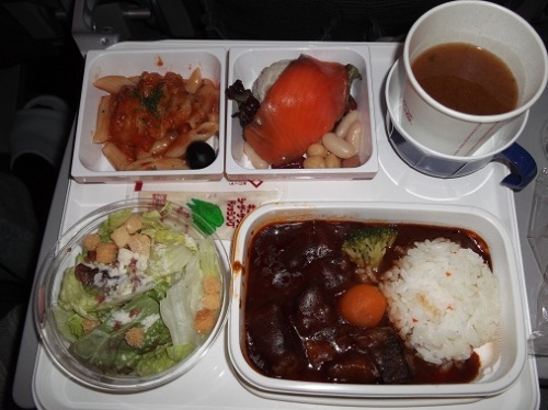 定刻、成田を出発するも真新しい機内を撮影したり、意味なくトイレに行ったり、モニタをチェックしまくりしている間に、1回目の食事時間になりました。機内食の選択肢は「ビーフorチキン」ではなく、「洋食or和食」のどちらか。こちらが、「洋食のビーフシチュー」とみそ汁(笑)そしてこちらが「和食の栗ご飯と煮物?とお蕎麦」747ジャンボ機以来、6.7年振り?にJALを利用しましたが、久々だからなのか中々美味しかったです、AAが不味すぎるのかも?<付け合せの洋食小鉢><和食の小鉢>デザートはハーゲン・ダッツのアイスクリーム!(AAにはないサービスで嬉しい!)2回目の機内食は、期間限定の「ケンタッキーフライドチキン」!まずは、左側の骨付きチキンを味わって、パンにもう1つのチキンとレタスを挟んでチキンフィレサンドを作ります。 コールスローも付いて美味しいです、ファースト・フードの方が色々と手を加えるよりも良いかもしれませんね?説明書には、ケンタの上手な食べ方が記載されています。以前は、モス・バーガーでしたよねCAの方に感想を聞かれました、ケンタは好評価のようです、帰国便は「吉野家の牛丼とのこと」、JALは色々と頑張ってますね! ←カチッ!っとクリック応援、お願いします♪♪