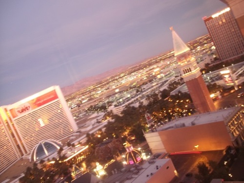 窓から見える眺望!ハラスからの眺望はどの部屋もこのレベルの眺望みたい?過去5回の滞在を見ても然程差がなく、ストリップ通に近い方のタワーでもカジノフロアが邪魔して通りは見えないみたいです。下の写真は午前6:30頃、日の出直前の景色!遠くの山並みからラスベガスの中心地まで、住宅地や通りの光の夜景は綺麗でしたよ!日中は遠くにRIO、目の前はMIRAGE、良くも悪くもないって所ですかね。MIRAGEのボルケーノが見下ろせるので、夜景は楽しめそうです。始まりました! ボルケーノの大噴火! 窓が少し開くので音楽も聞こえて迫力が部屋の中に居ても伝わってきます。ショー終了前の大噴火! 滞在中、5~6回楽しんだので流石に満腹です! ←カチッ!っとクリック応援、お願いします♪♪