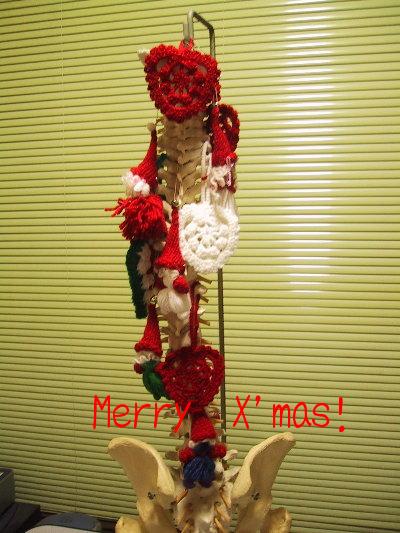今年もいよいよ残すところわずかとなってきました。街もクリスマスのイルミネーションが輝いています。(なんだか各家庭のライトアップが年々派手になってきた気がしませんか?)今年もたくさんの素敵な出会いがありました。毎日が喜びに満ち溢れていた気がします。来年はもっと素晴らしい出会いが待っています。(肝心な出会いはなかなか実らなかったけどね。。。)そして、自分自身が大きく変化していく。。来年はそんな年になっていきます。なんだかワクワクしちゃいますね!そんなワクワクの気持ちを込めて私からのクリスマスプレゼントです。それはジャーン!! 治療室にある脊柱模型にクリスマスのデコレーションをしてみました!しかも「これ骨に飾って!」と頂いたものばかりだったりする。うちにお見えになる方はシャレの分かる方ばかりです。ちなみにうちはクリスマスイブイブもクリスマスイブも、そしてクリスマス当日も仕事だったりします。。。そう、私の恋人は仕事なんです。(と、強がってみたりもする。。。)どうぞ、楽しいクリスマスをお過ごしくださいね!久しぶりにブログ管理ページに来てみたらずいぶん様子が変わっていてちょっとビックリです。(もう、すっかり日記では無くなっているな、自分)